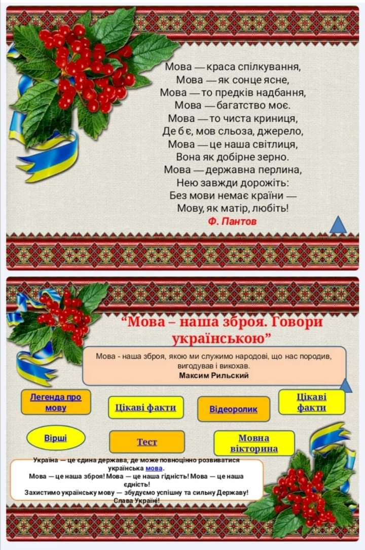 Мова – наша зброя, якою ми служимо народові, що нас породив, вигодував і виховав. Саме вона – наш щит, наша особливість, маркер, який визначає нашу неповторність. Українська мова могутня, глибинна. І кожне слово має свій відтінок: сум, радість, гумор, щедрість, щирість. Мова розчулює, закликає до боротьби, клекоче у ненависті до зла, несправедливості, насильства.