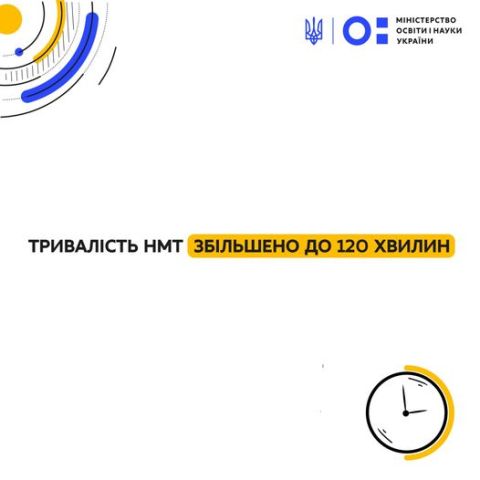 Тривалість національного мультипредметного тесту (НМТ – форма проведення вступного випробування на бакалаврат для здобуття вищої освіти в Україні, введеного у 2022 році через повномасштабне російське вторгнення в Україну) збільшено до 120 хвилин.