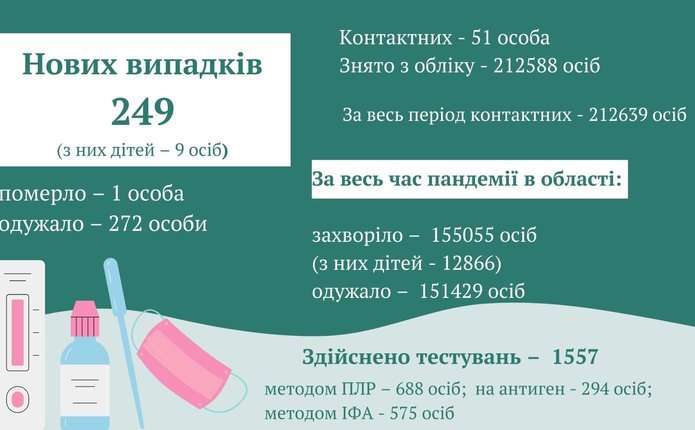 За 20 тиждень 2022 року (16-22 травня) в Чернівецькій області зафіксовано 249 нових випадків коронавірусної хвороби COVID-19 (з них дітей – 9, медпрацівників – 1).