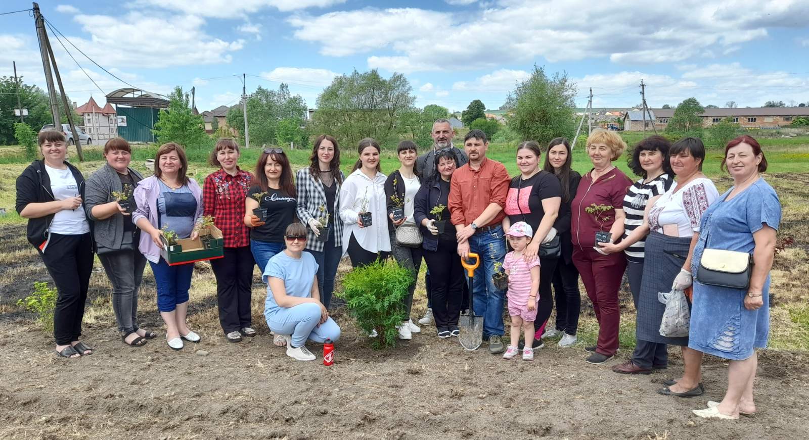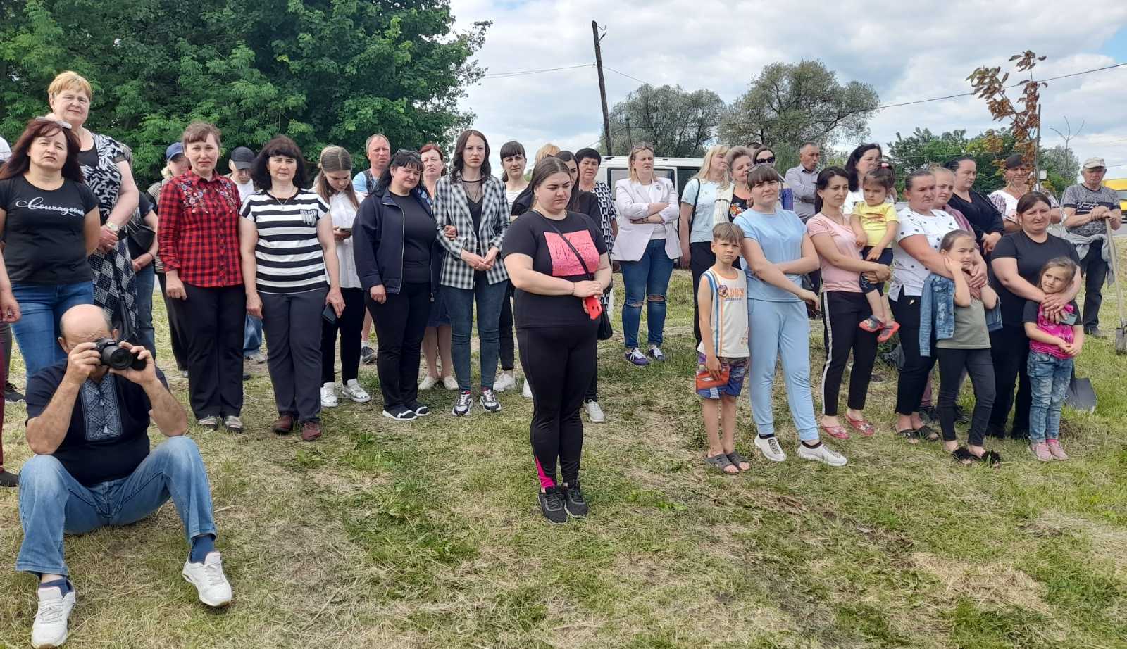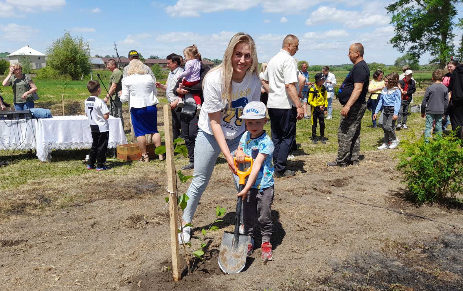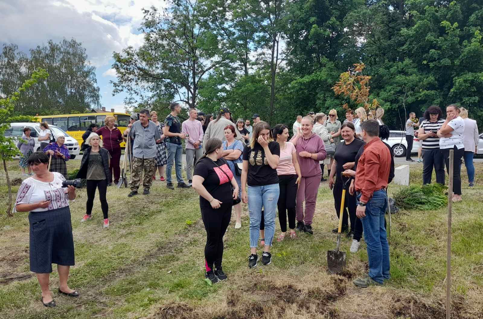 Атмосфера заходу дуже щира:  висаджують деревця сім’ями, доєдналися учні місцевої школи на чолі з вчителями та директором МИКОЛОЮ БОДНАРЮКОМ, на акцію приїхали старости та переселенці з інших сіл громади. Люди знайомляться, підбадьорюють одне одного словами віри в перемогу!
