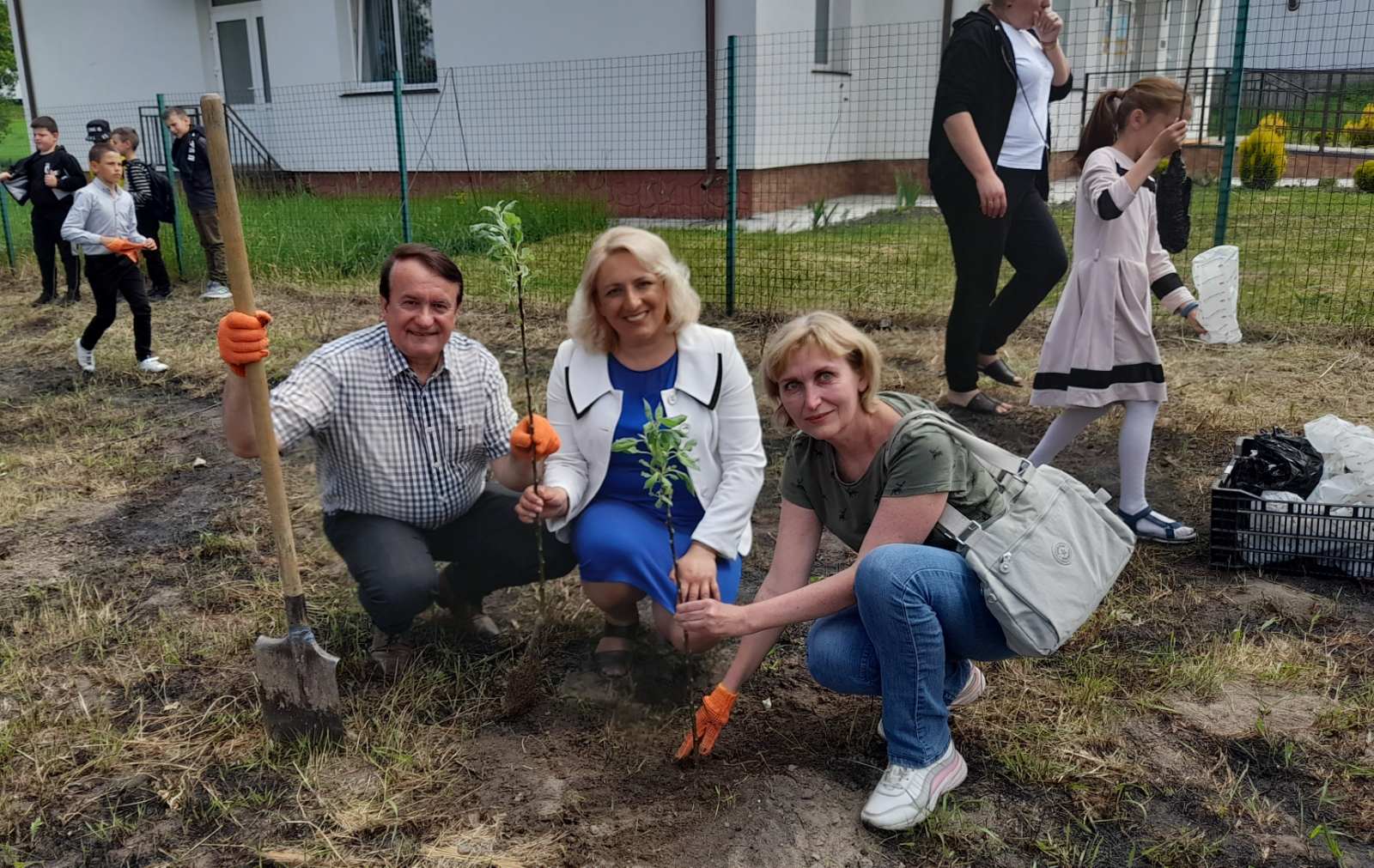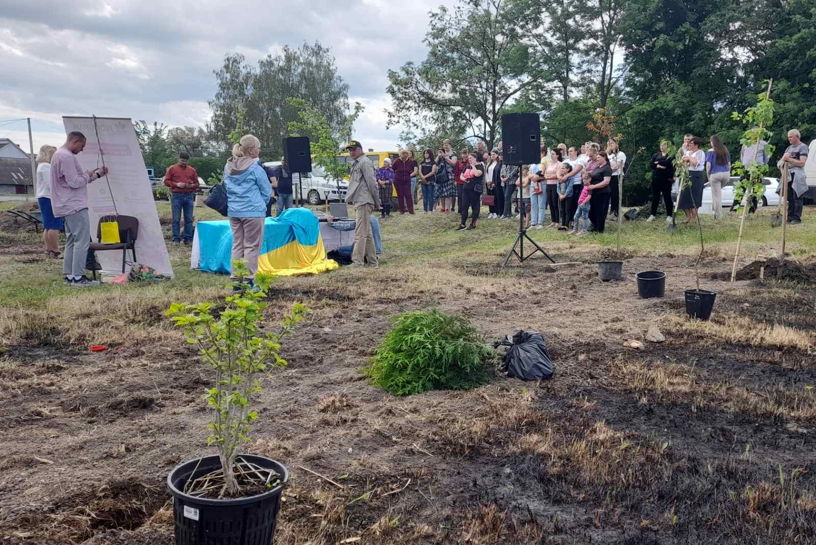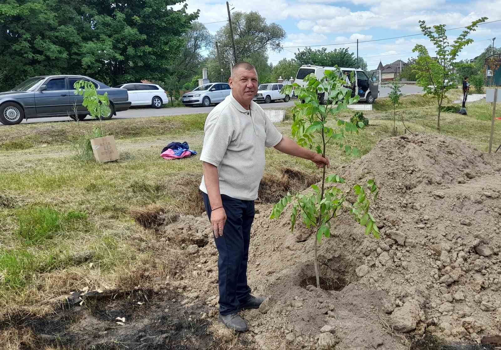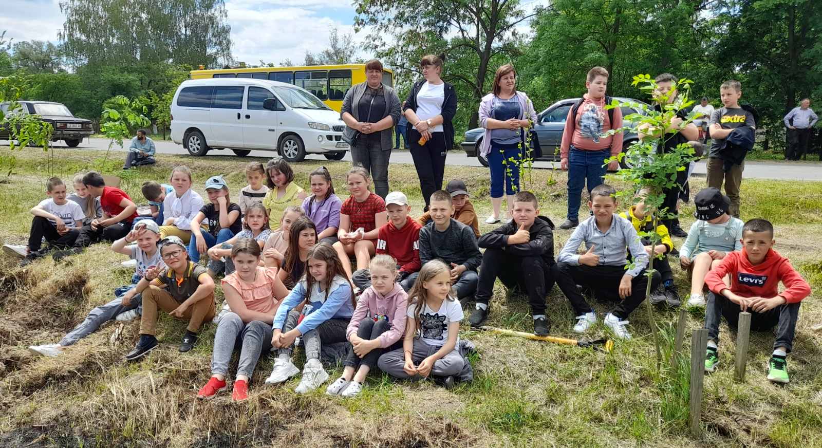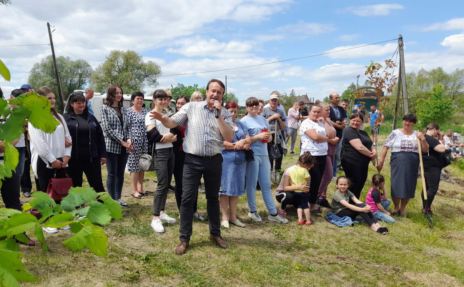 Атмосфера заходу дуже щира:  висаджують деревця сім’ями, доєдналися учні місцевої школи на чолі з вчителями та директором МИКОЛОЮ БОДНАРЮКОМ, на акцію приїхали старости та переселенці з інших сіл громади. Люди знайомляться, підбадьорюють одне одного словами віри в перемогу!