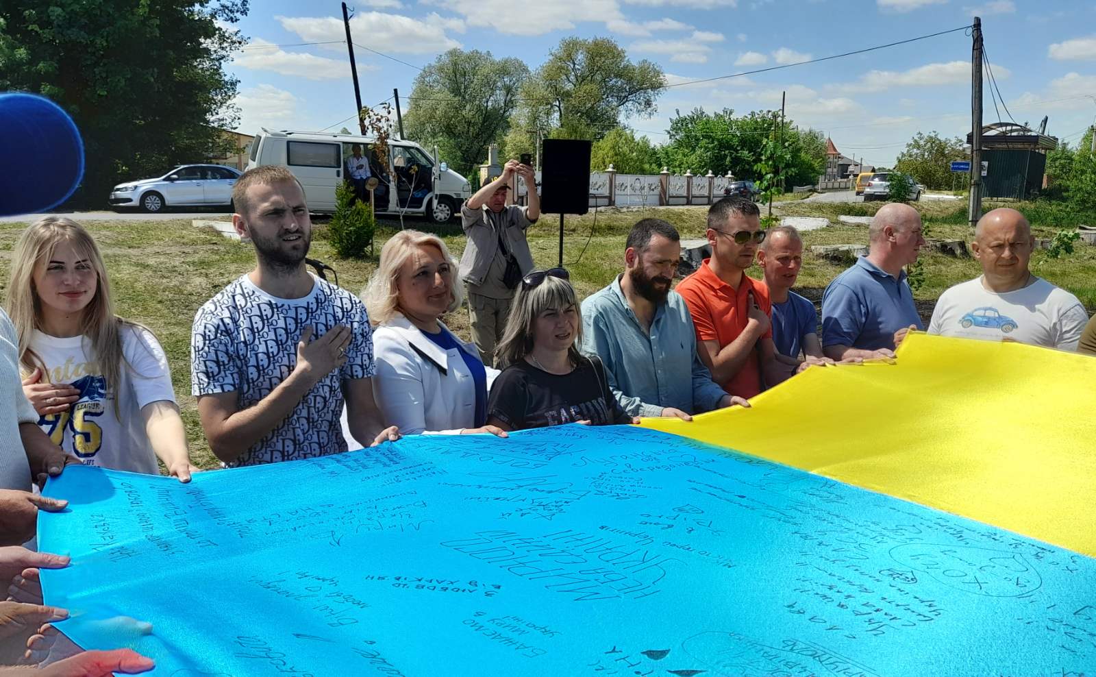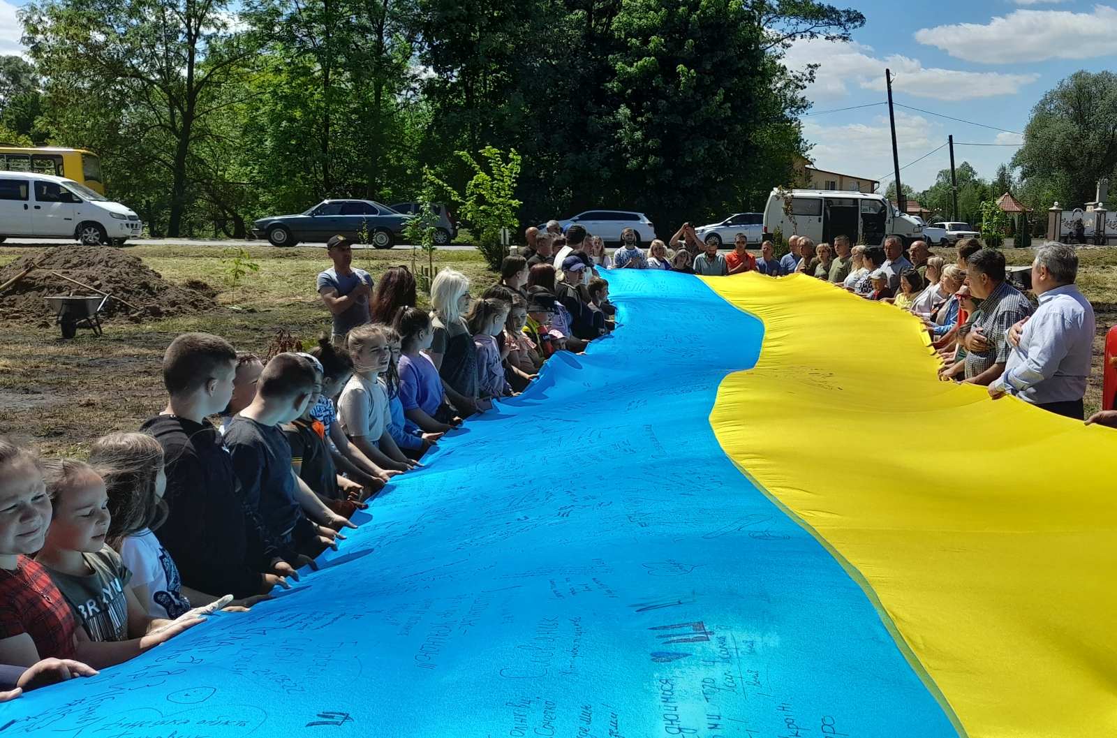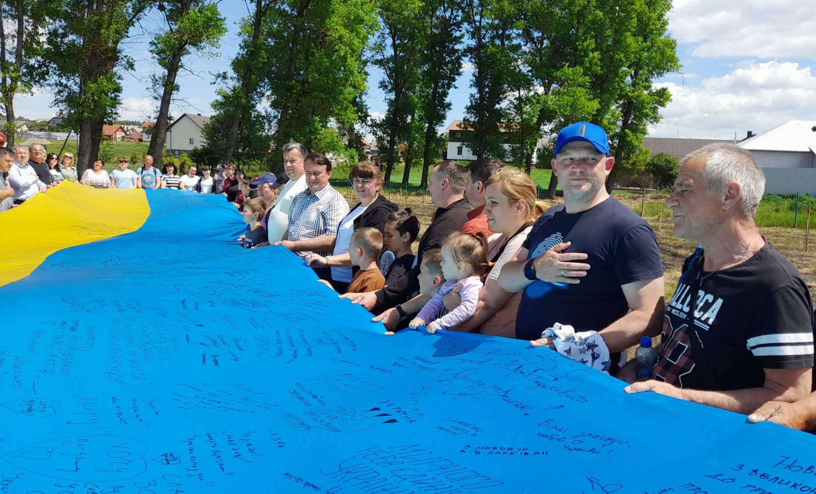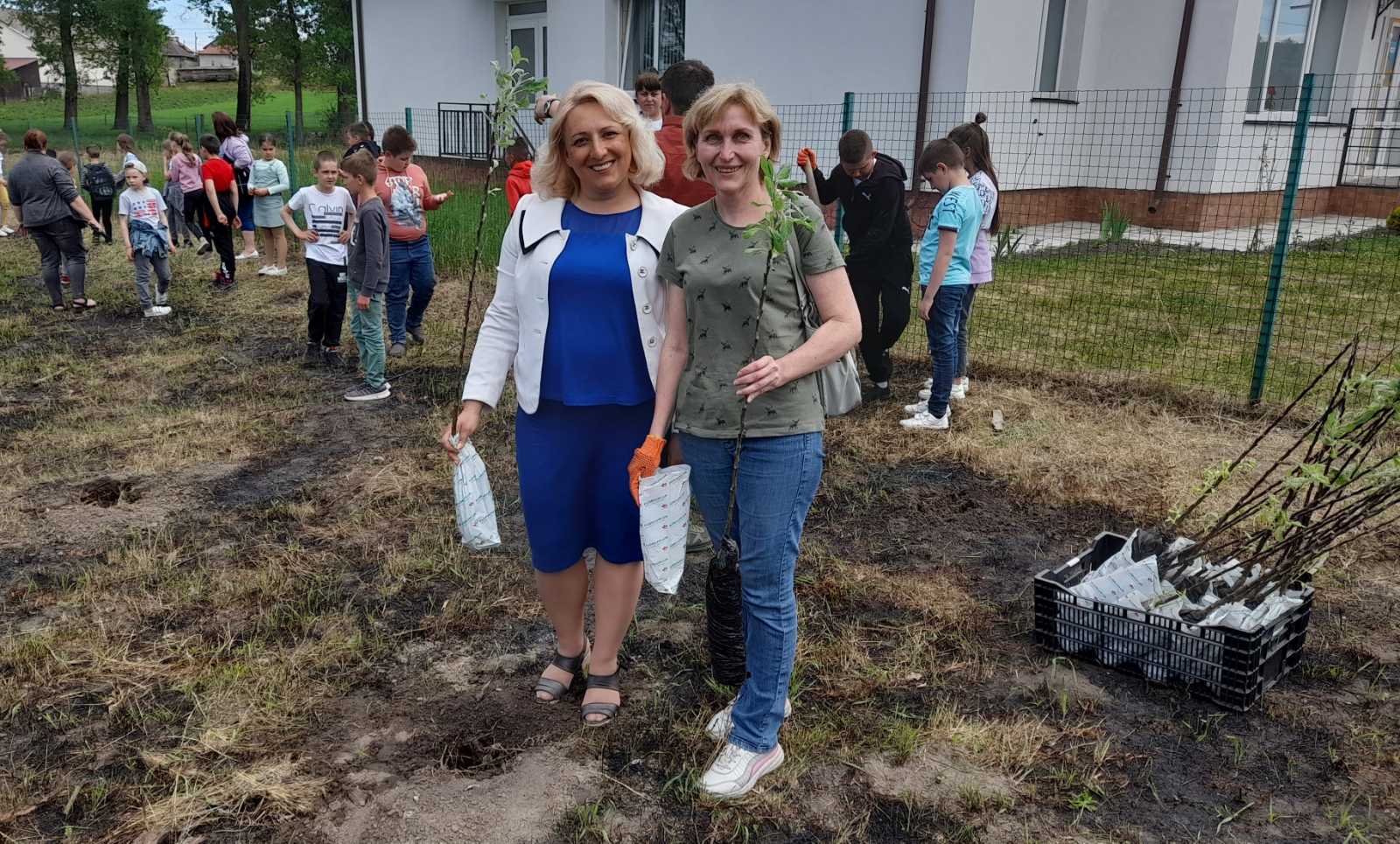 Атмосфера заходу дуже щира:  висаджують деревця сім’ями, доєдналися учні місцевої школи на чолі з вчителями та директором МИКОЛОЮ БОДНАРЮКОМ, на акцію приїхали старости та переселенці з інших сіл громади. Люди знайомляться, підбадьорюють одне одного словами віри в перемогу!