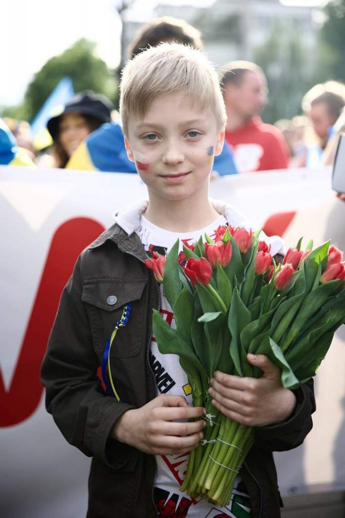 Упродовж маршу українці роздавали полякам квіти та синьо-жовті бантики. Вони скандували «Спасибі», «Дякуємо» та «Нехай живе Польща».