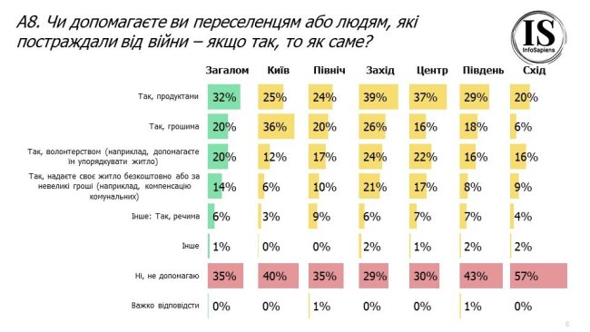 Найбільше залучені до допомоги ВПО та постраждалим жителі західних та центральних областей (допомагають 71% та 70% відповідно), найменш – жителі Півдня (57%) та Східної України (43%), ймовірно, через те, що ці регіони страждають від активних бойових дій і меншою мірою приймають переселенців та мають змогу допомогти.