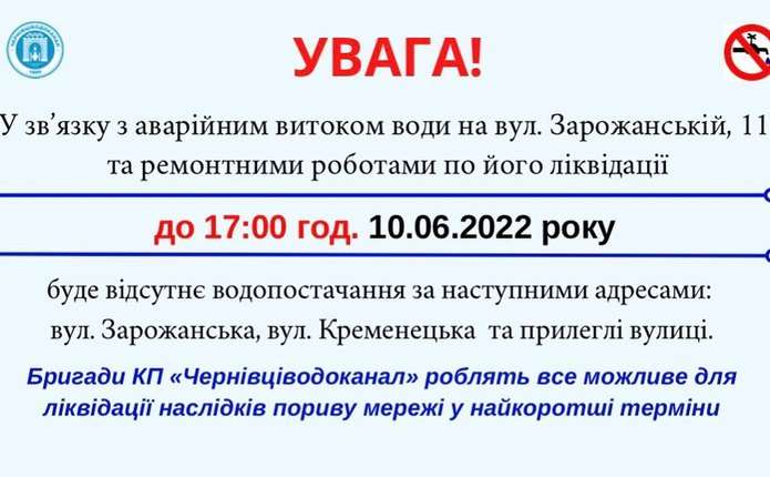 У зв`язку з витоком води на вул. Зарожанській, 11, від учора з 18:30 до 17:00 10 червня 2022 року, немає водопостачання в будинках на вулицях: Зарожанська, Кременецька та прилеглих. Про це повідомляє КП «Чернівціводоканал».