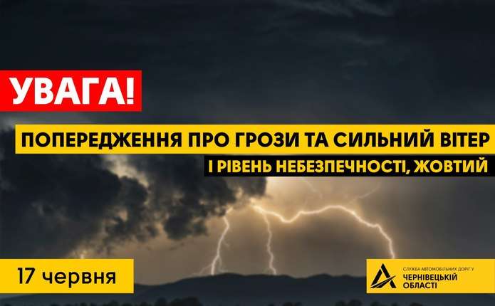 Вдень 17 червня 2022 року у Чернівецькій області очікуються грози. Також прогнозують шквалисті пориви вітру 15-20 м/с. Синоптики оголосили І рівень небезпечності, жовтий.