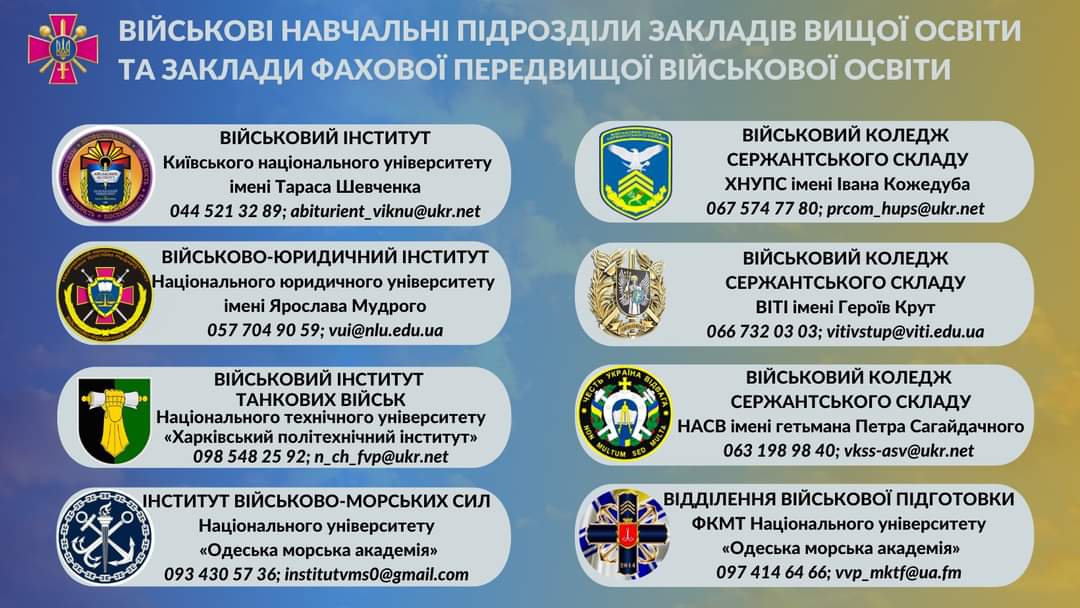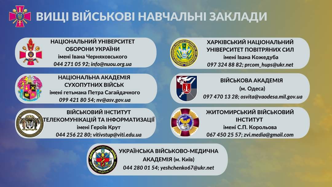 − Цьогорічна вступна кампанія в умовах широкомасштабної російської збройної агресії суттєво відрізняється від попередніх, зокрема, розмаїттям варіантів участі абітурієнтів у конкурсному відборі, спрощеним механізмом подання документів, проходженням первинного медогляду та військово-лікарської комісії. Якщо хтось не в змозі оформити особову справу вступника в територіальних центрах комплектування та соціальної підтримки за місцем проживання, є можливість зробити це в обраному військовому навчальному закладі − особисто або віддалено − шляхом надсилання документів засобами поштового зв’язку чи на електронну пошту, що, погодьтеся, досить зручно, − зазначив директор Департаменту військової освіти і науки Міністерства оборони України Володимир Мірненко.