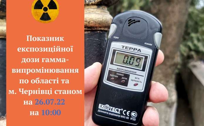 26 липня 2022 року, станом на 10:00 годину, показник дози гамма-випромінювання у Чернівцях та у Чернівецькій області знаходиться у межах норми та не перевищує 0,12 мкЗв/год.
