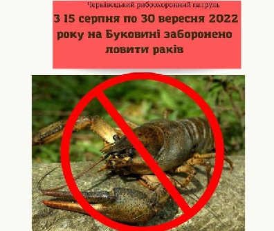 В період з 15 серпня 2022 року по 30 вересня 2022 року встановлюється заборона на вилов раків в рибогосподарських водних об’єктах у районі діяльності Чернівецького рибоохоронного патруля.