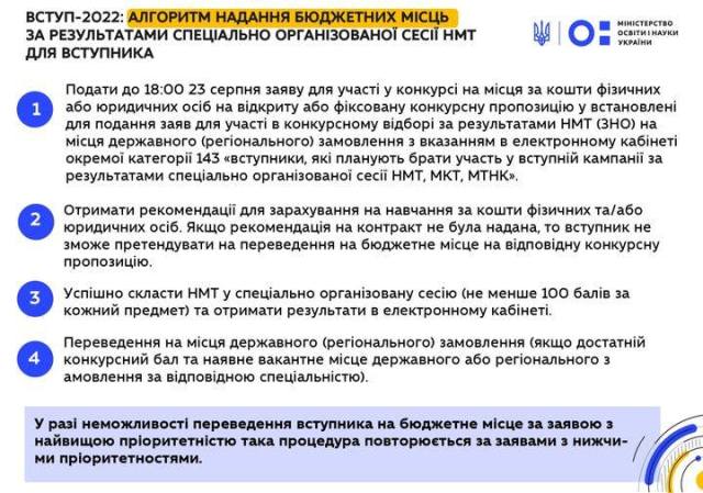 Докладніше: https://mon.gov.ua/ua/news/vstup-2022-algoritm-nadannya-byudzhetnih-misc-za-rezultatami-specialno-organizovanoyi-sesiyi-nmt-dlya-vstupnika?fbclid=IwAR3g4Mg88P9WJ_TMkF3YtrAeSUa4yjb9ehlAJPqjFpH6kXgj_BN4UiWgocs