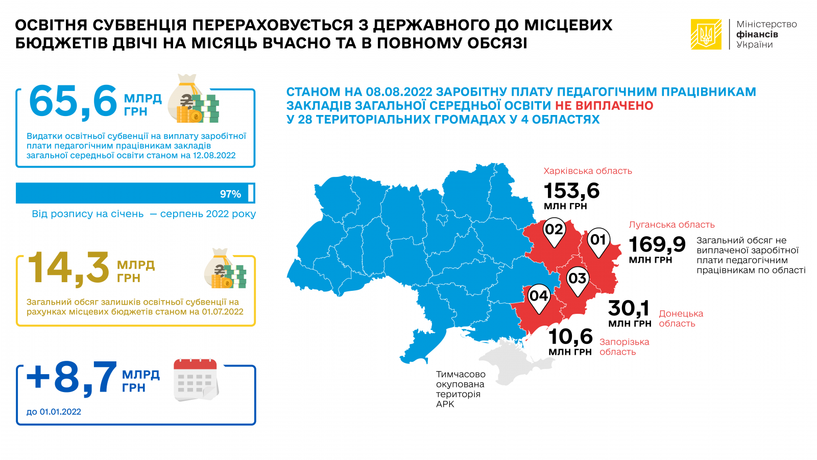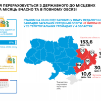 Однак, за оперативною інформацією Міністерства освіти і науки України, станом на 8.08.2022 заробітну плату педагогічним працівникам закладів загальної середньої освіти не виплачено у 28 територіальних громадах Донецької, Запорізької, Луганської, Харківської областей. Водночас у Миколаївській області станом на 01.08.2022 заробітну плану виплачено. Невиплати насамперед спричинені окупаційним режимом у цих регіонах.