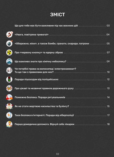 У цьому посібнику зібрано поради від А до Я, які допоможуть дітям, батькам, викладачам зберегти здоров’я й життя. Тут є відповіді на найактуальніші запитання воєнного сьогодення, насамперед, для дітей: що робити під час «Повітряної тривоги», роз’яснення щодо небезпеки мін, бомб, гранат та снарядів. Рекомендації, як діяти під час найрізноманітніших надзвичайних ситуацій: хімічної атаки, радіоактивного забруднення тощо. Включно з Правилами дорожнього руху, а також актуальними темами булінгу та безпеки в інтернеті.