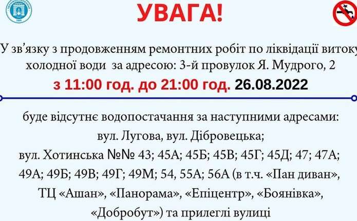 У Чернівцях, в зв’язку із продовженням ремонтних робіт по ліквідації витоку холодного водопостачання по 3-му провулку Я. Мудрого, 2, буде відсутнє водопостачання 26 серпня 2022 року до 21.00 год. на будинки наступних вулиць: