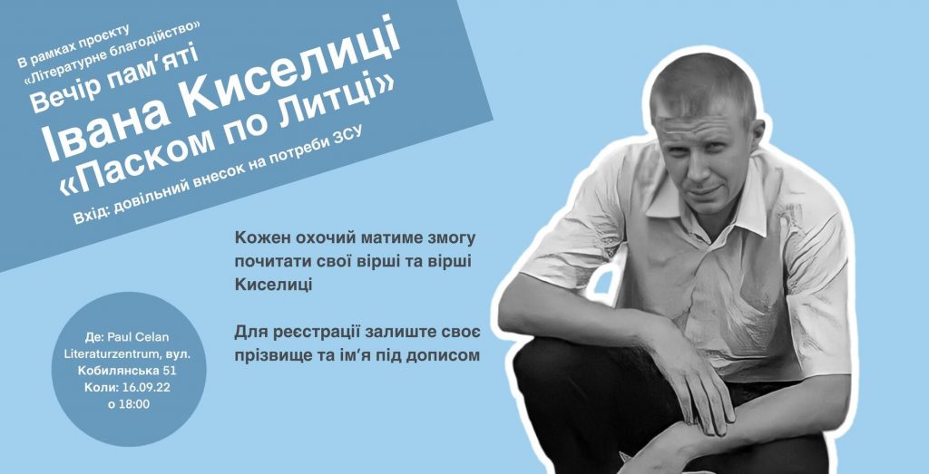 У п’ятницю, 16 вересня у Літературному целанівському центрі пройде благодійний вечір пам’яті буковинського поета та викладача Івана Киселиці. Про це повідомляють організатори вечора, проєкт «Літературне благодійство» у Facebook.