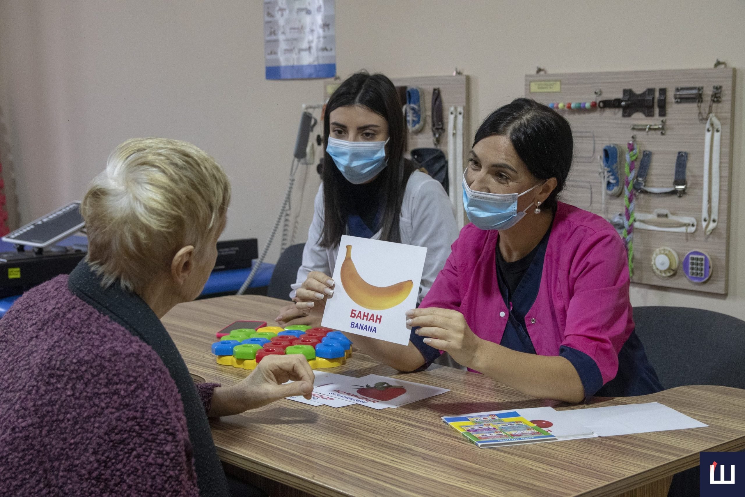 За столом – 71-річна Катерина з Маріуполя. Вона уважно дивиться на картинки, які їй показує ерготерапевтка, а потім по складах повторює за нею слова: «пер-чик», «кар-топ-ля». Коли в жінки виходить, фахівчиня підбадьорює її: «Яка ж ви молодець! Ще трохи – і будемо з вами борщі варити!»