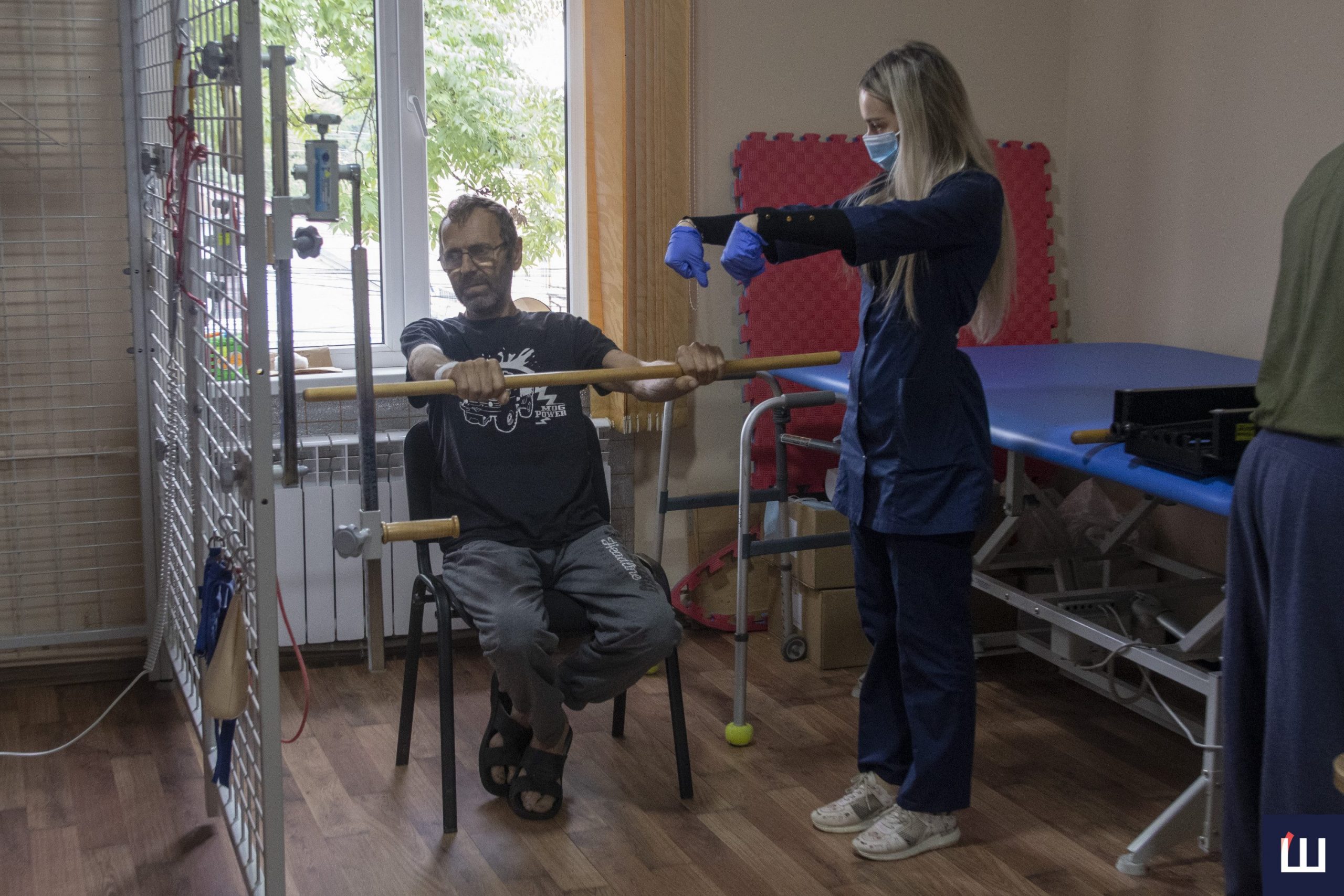 Поруч із Катериною на спеціальному тренажері для рук працює Ярослав. Чоловік теж переніс інсульт і робить усе, щоб одужати та повернутися до роботи.