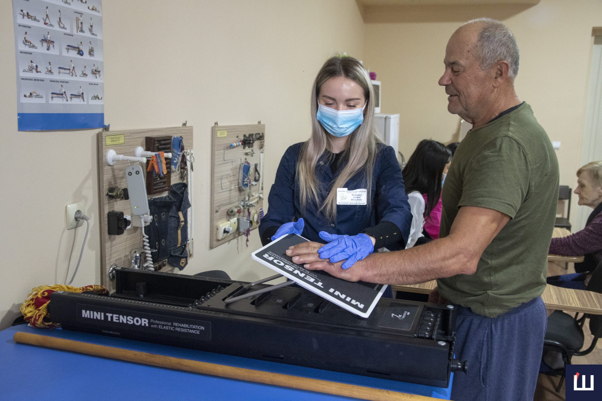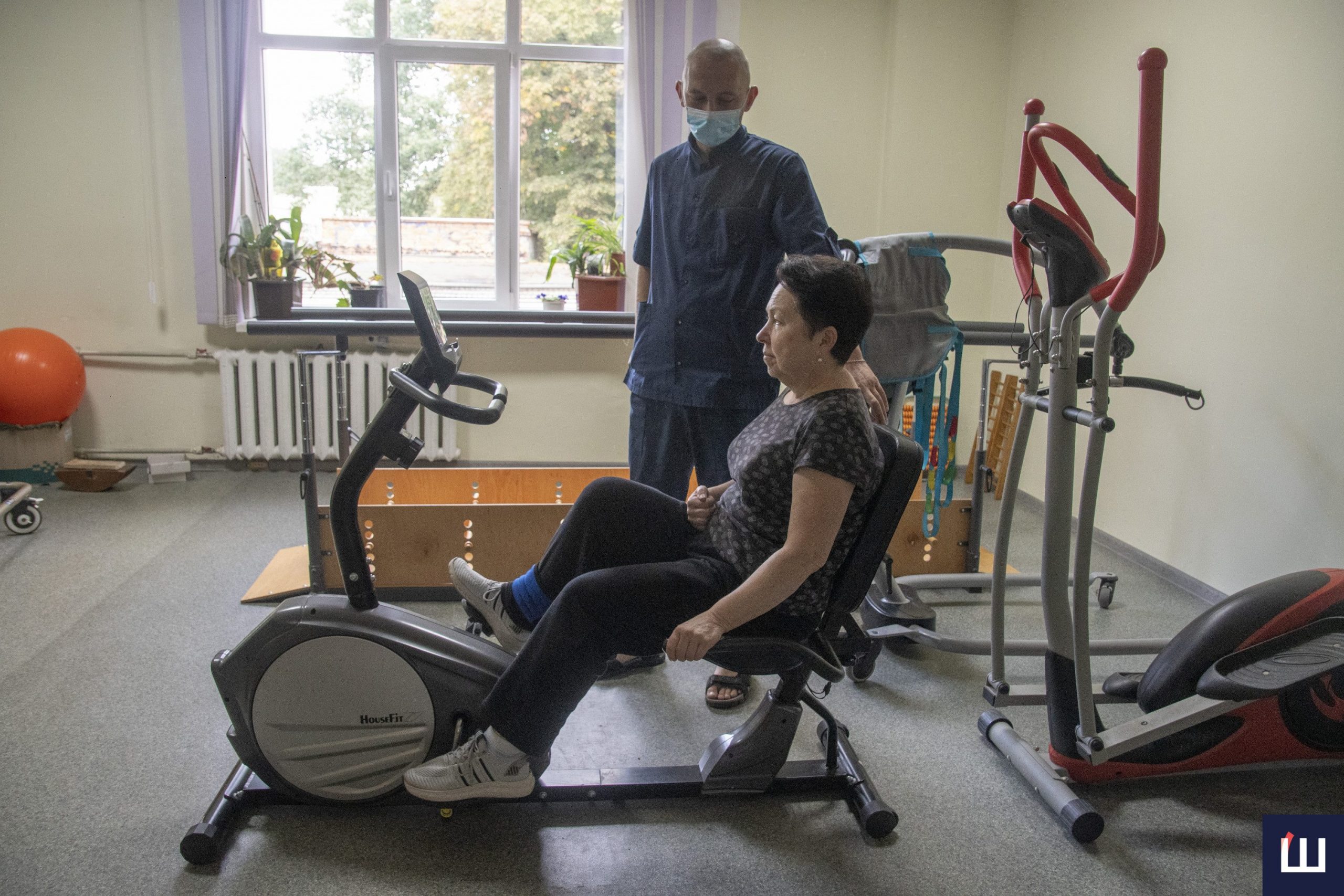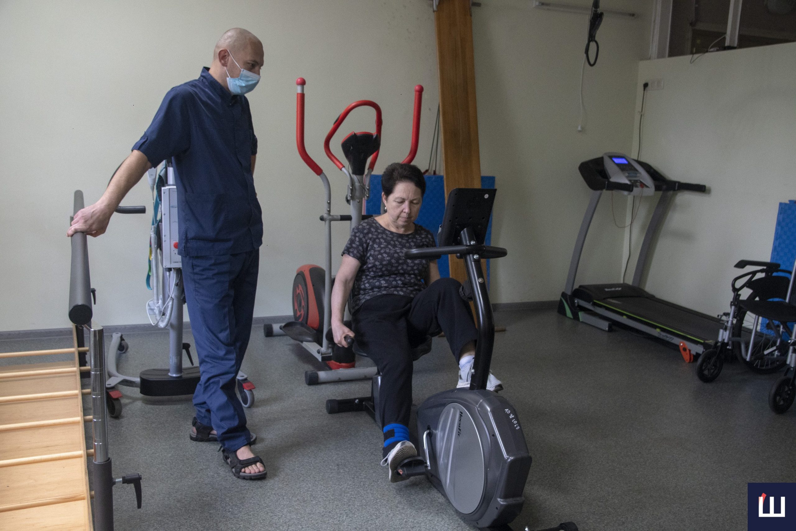 На велотренажері під керівництвом фізичного терапевта крутить педалі Світлана Дмитренко. У неї стався інсульт під час бомбардування Миколаєва. У рідному місті їй надали медичну допомогу і порадили їхати подалі – у більш безпечне місто, де вона зможе займатися реабілітацію і не чути вибухів.
