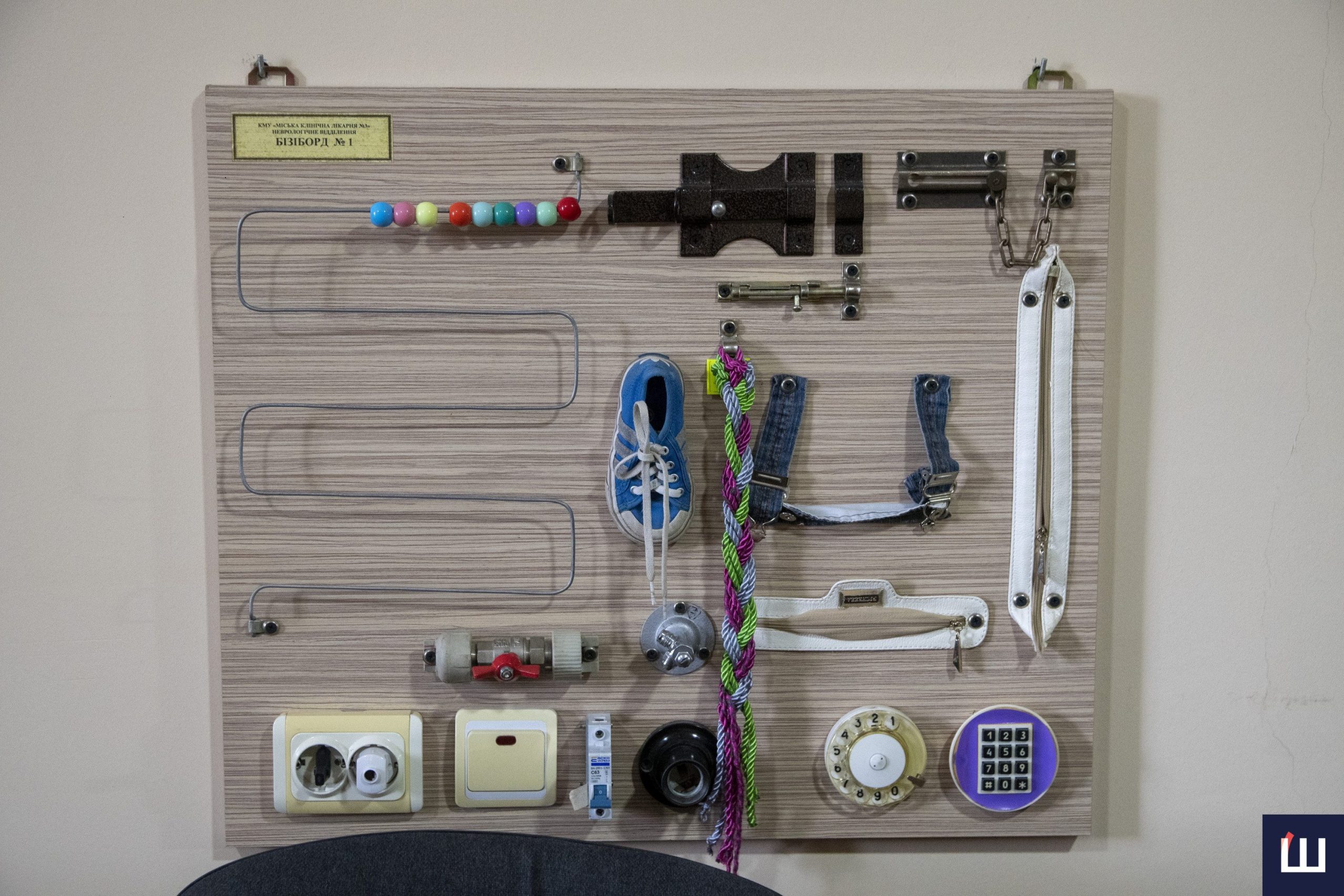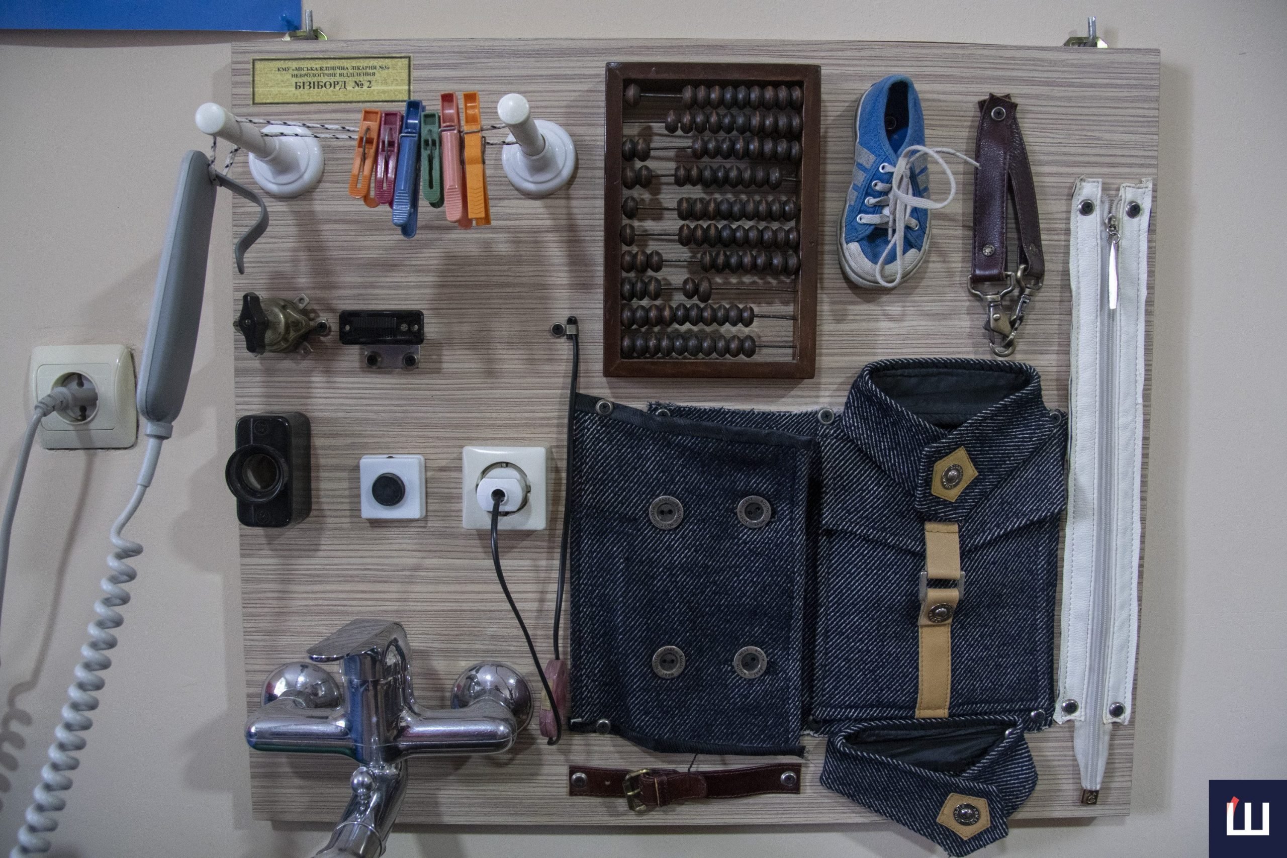 У кабінеті – мозаїка, яскраві картинки, а також бізіборди з імітацією застібок, вмикачів, шнурівок тощо. Щоправда, «бавляться» з цим не діти, а дорослі люди, які перенесли інсульт. Саме на таких, здавалося б, іграшкових, предметах вони заново вчаться найпростіших навиків.