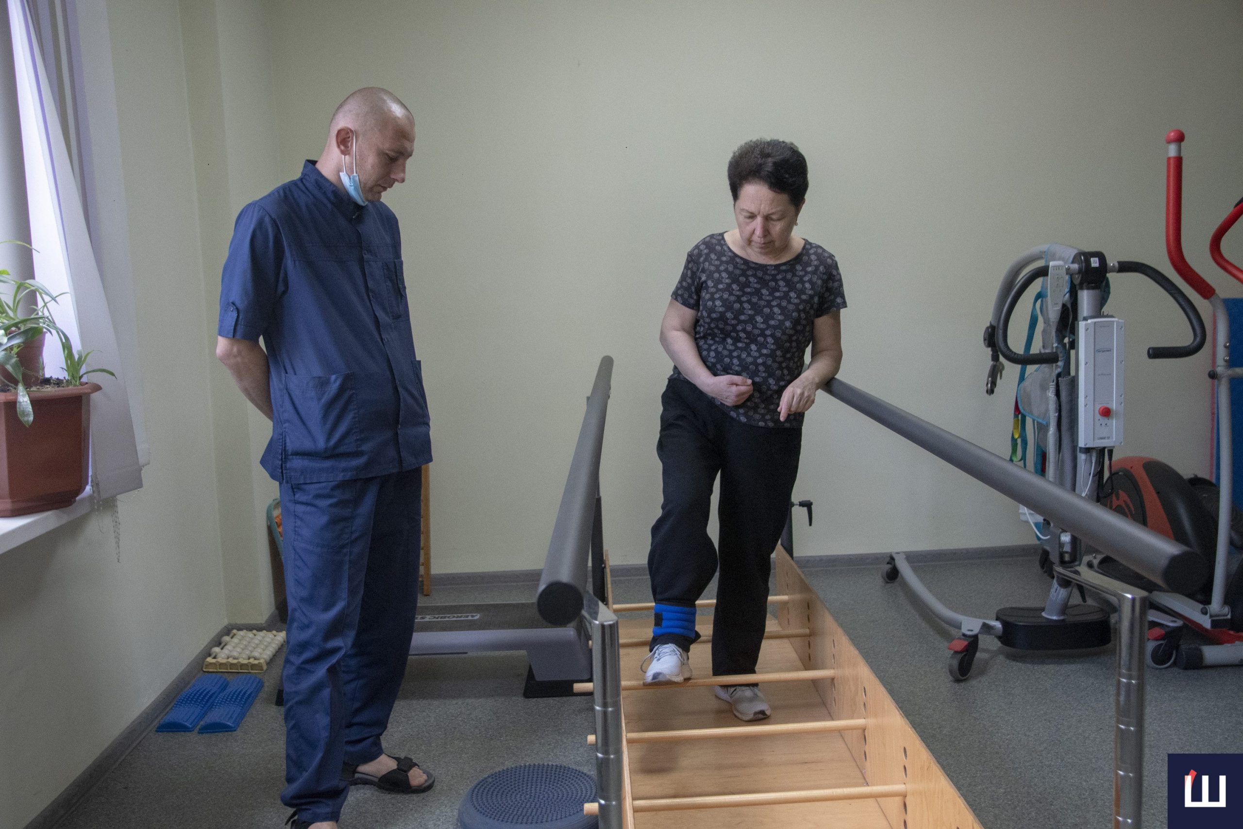 Фізичний терапевт Микола Попович підбадьорює пацієнтку: хвалить, коли вона переступає перешкоди та впевнено ступає.