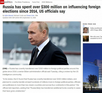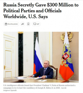 Розвідка США встановила, що за останні вісім років РФ таємно фінансувала іноземні політичні партії, окремих політиків та чиновників у понад 20 країнах. Передбачається, деякі перекази Росії могли залишитися непоміченими. За даними США, російська влада планувала витратити ще сотні мільйонів доларів на таке фінансування.