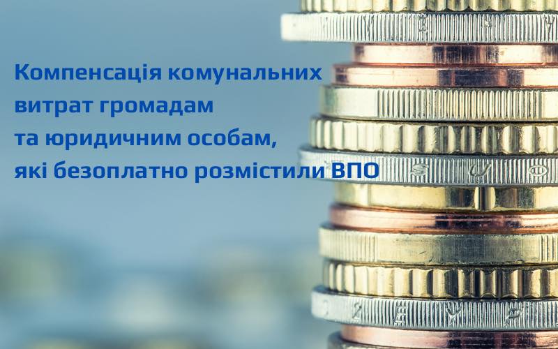 Постановою Кабінету Міністрів України від 11 березня 2022 р. № 261 затверджений механізм надання компенсації на оплату комунальних послуг закладам державної та комунальної форми власності, а також закладам освіти приватної форми власності, які надають прихисток внутрішньо переміщеним особам. Наразі з резервного фонду Державного бюджету на компенсації за березень-квітень громадам і державним органам виділено 349,7 млн грн та центральним органам виконавчої влади – 20 млн грн.