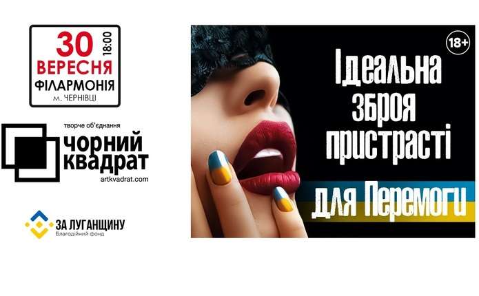 Чернівці, зутрічайте комедію театру «Чорний Квадрат» – «Ідеальна зброя пристрасті для Перемоги». Вистава відбудеться 30 вересня в Чернівецькій обласній філармонії. Початок о 18.00 годині.