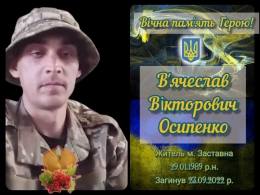 На війні загинув 33-річний воїн В’ячеслав Вікторович Осипенко, житель міста Заставна.