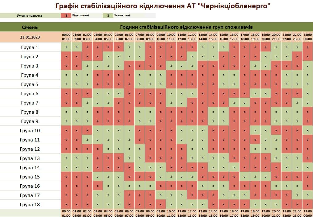 У Чернівецькій області оприлюднили графік стабілізаційних вимкнень електроенергії на сьогодні, 23 січня. Про це повідомляють в АТ «Чернівціобленерго».