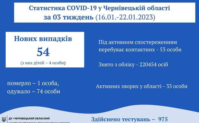 За результатами оперативного епідеміологічного аналізу за 3-й тиждень в Чернівецькій області зареєстровано 54 випадки COVID-19, в тому числі 4 випадки серед дітей. В порівнянні з попереднім тижнем 2023 року, захворюваність зросла на 17 випадків, одночасно, захворюваність серед дітей зросла на 2 випадки.