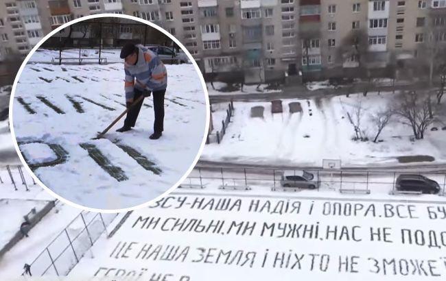 На Віниччині місцевий житель малює різноманітні велетенські написи задля підтримати ЗСУ. Робить він це на снігу.
