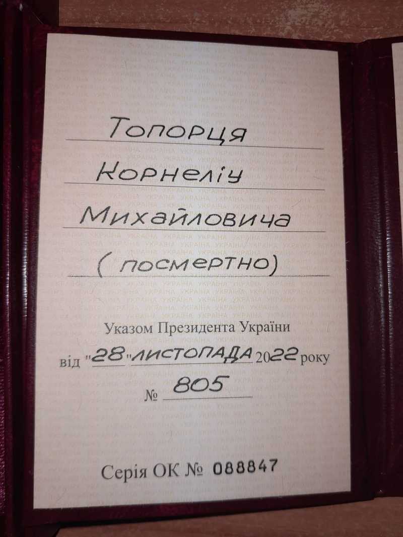 Орденом «За мужність» ІІІ ступеня посмертно відзначений буковинець, житель села Несвоя Мамалигівської громади, Корнеліу Топорець. Про це повідомляє Чернівецька обласна рада.