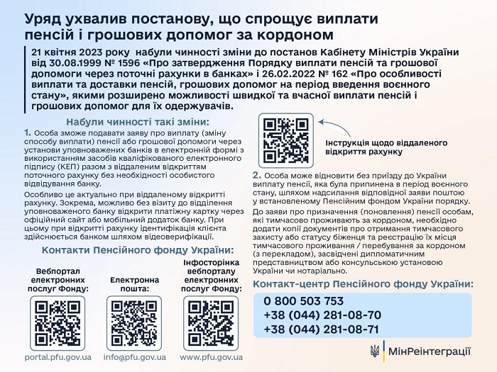 Уряд спростив механізм виплати українських пенсій і грошових допомог для тих одержувачів, які тимчасово проживають за кордоном. Про це йдеться на офіційному вебсайті Мінреінтеграції.