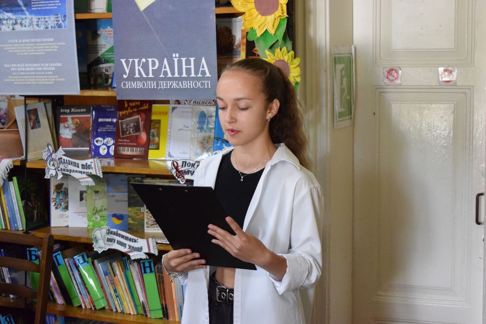 Про історичні передумови прийняття Основного Закону держави та державну символіку йшлося під час правового заходу. В залі прозвучав Гімн України, який заспівали всі учасники заходу. Учениця 8-А класу ЗЗСО І – ІІІ ст. №1 Дехтяр Влада емоційно продекламувала вірш, присвячений Дню Конституції, який нещодавно написала активна читачка центральної бібліотеки, внутрішньо переміщена особа з міста Херсону Скрипник Галина Володимирівна. Учнівська молодь ВПУ: Влад Кондрюк, Швець Валерія та Ткачук Ігор майстерно зачитали вірші про державну символіку.