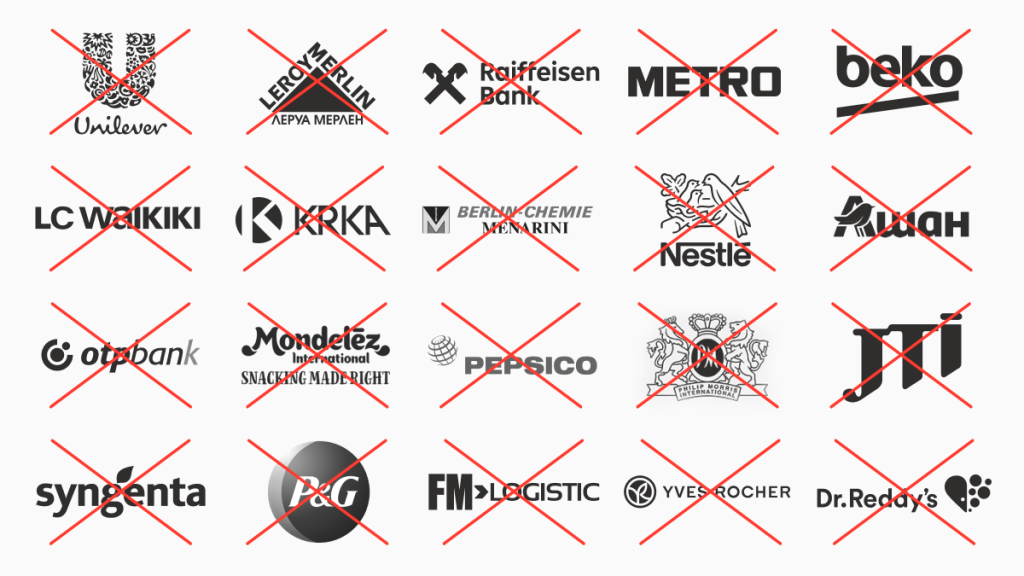 Серед компаній, що не вийшли з ринку рф: «Raiffeisen Bank», «Metro», «LC Waikiki», «Nestle», «Auchan», «OTP bank», «Mondelez», «Pepsico», «P&G», «Yves Rocher» та інші бренди.