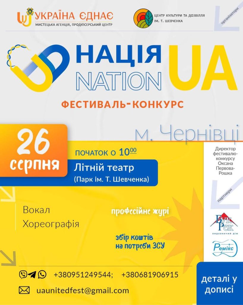 У суботу, 26 серпня, у парку імені Тараса Шевченка відбудеться благодійний мистецький фестиваль-конкурс «НАЦІЯ.UA. NATION.UA», присвячений до Дня Незалежності України.