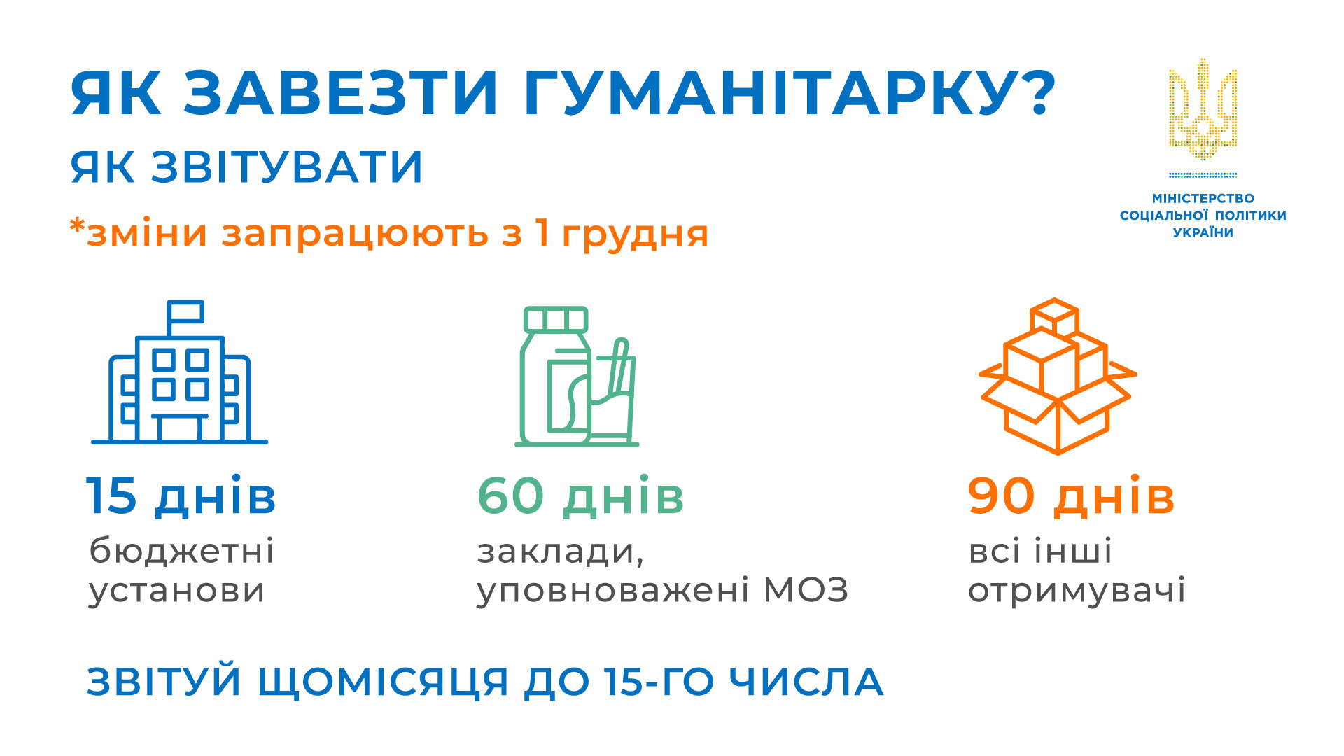 Звітуй щомісяця до 15-го числа наростаючим підсумком та слідкуй за чітким і прозорим обліком гуманітарної допомоги.