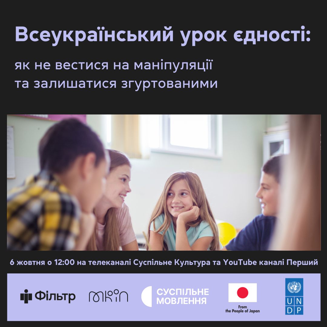 Національний проєкт з медіаграмотності «Фільтр» Міністерства культури та інформаційної політики України спільно з Національною суспільною телерадіокомпанією України готує телевізійний урок «Всеукраїнський урок єдності» для школярів 5-11 класів, їхніх батьків та вчителів з усієї України, який буде присвячений темі протидії дезінформації та маніпуляціям.