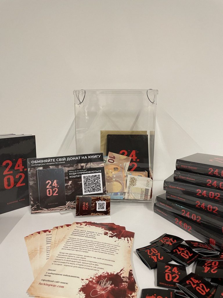 Книгу «24.02» не продавали, а обмінювали на донат. Загалом було обміняно близько 100 книг на суму понад 50 000 грн. Усі гроші спрямують на допомогу ЗСУ, зокрема, ремонт евакуаційної техніки.
