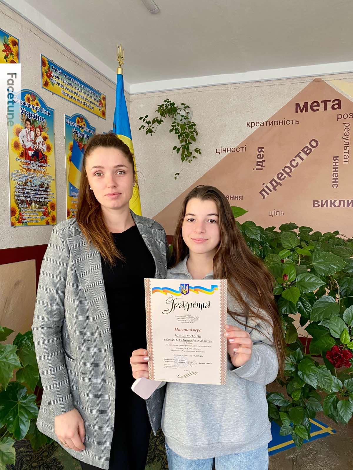 В номінації «Природоохоронні території» І місце виборола Кумань Юліана, учениця ОЗ «Михалківський ліцей» (керівник – Бурденюк Тетяна Сергіївна).