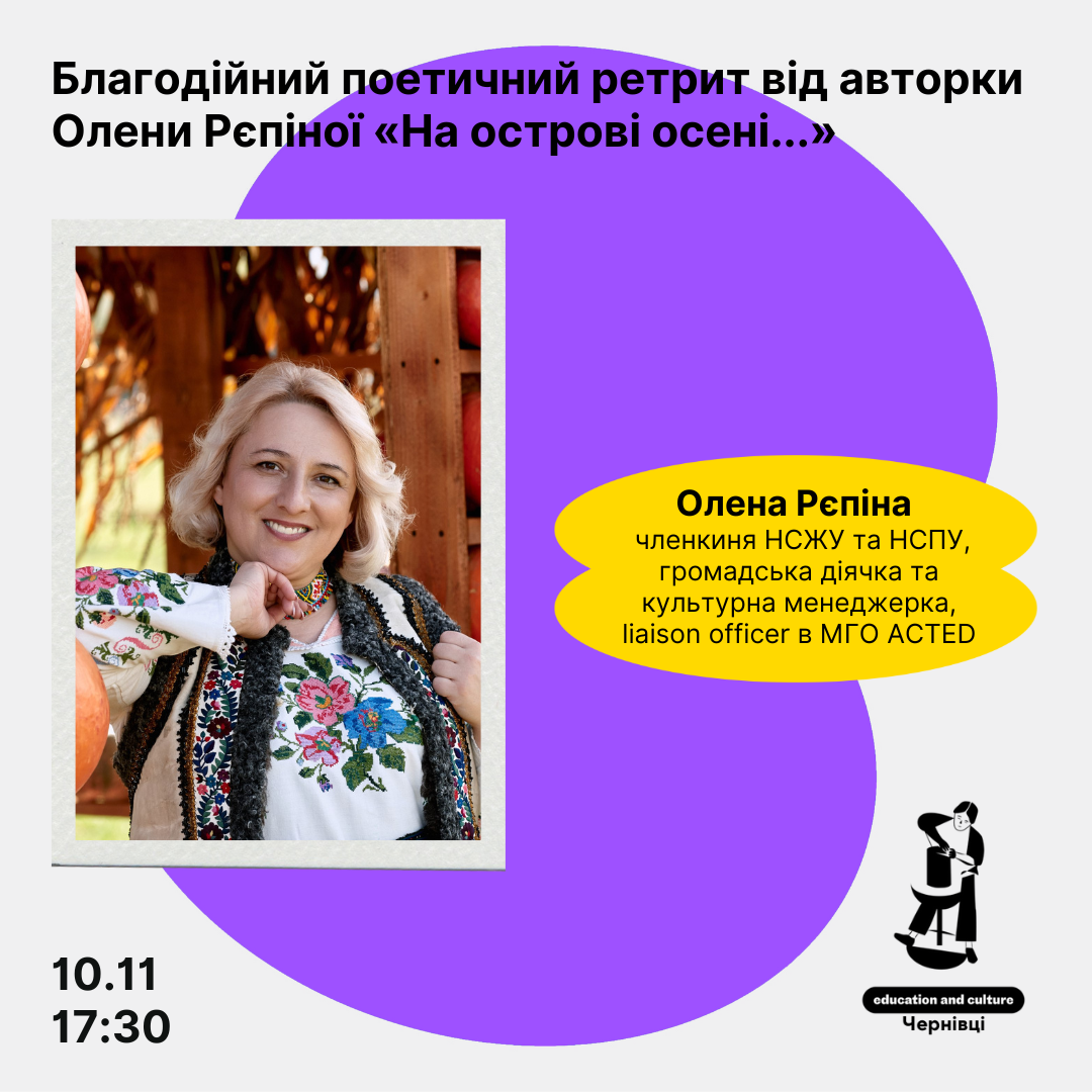 У чернівецькому Гончаренко центрі відбудеться благодійний захід «На острові осені…» за участі громадської діячки Олени Рєпіної.