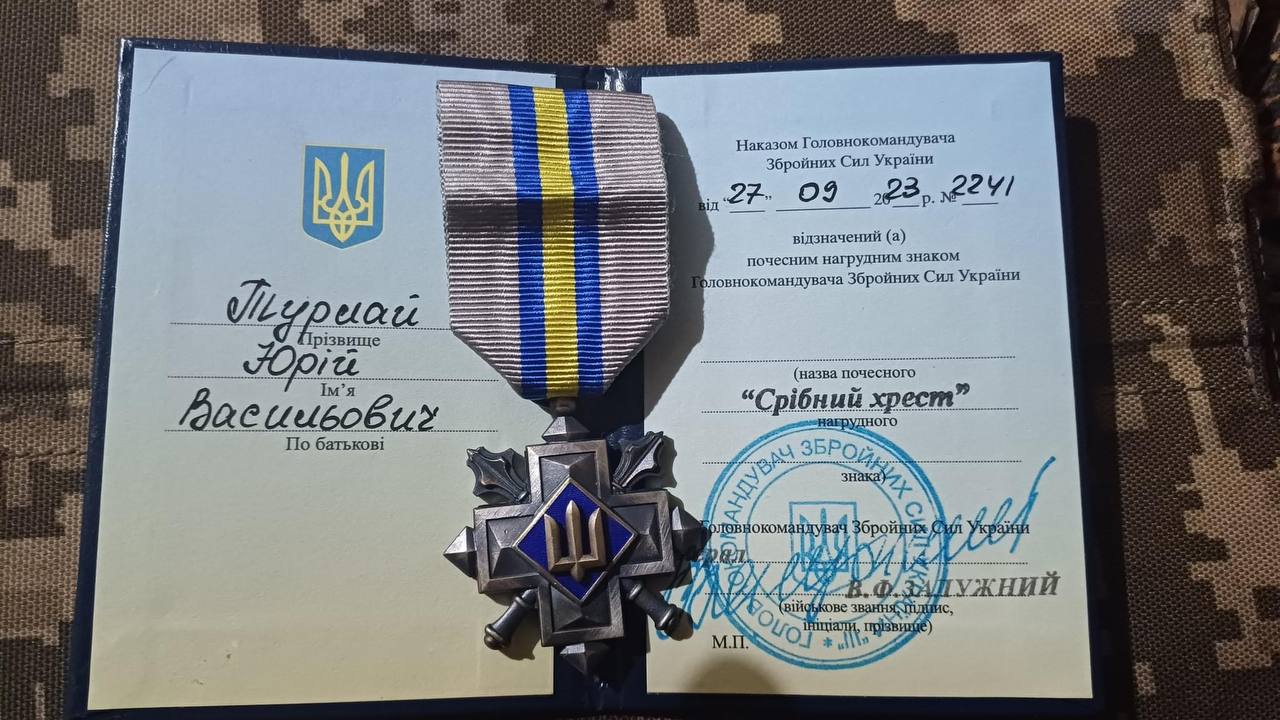 «Срібний хрест» від Головнокомандувача Збройних сил України Валерія Залужного отримав Юрій Турлай з позивним Рудольф.