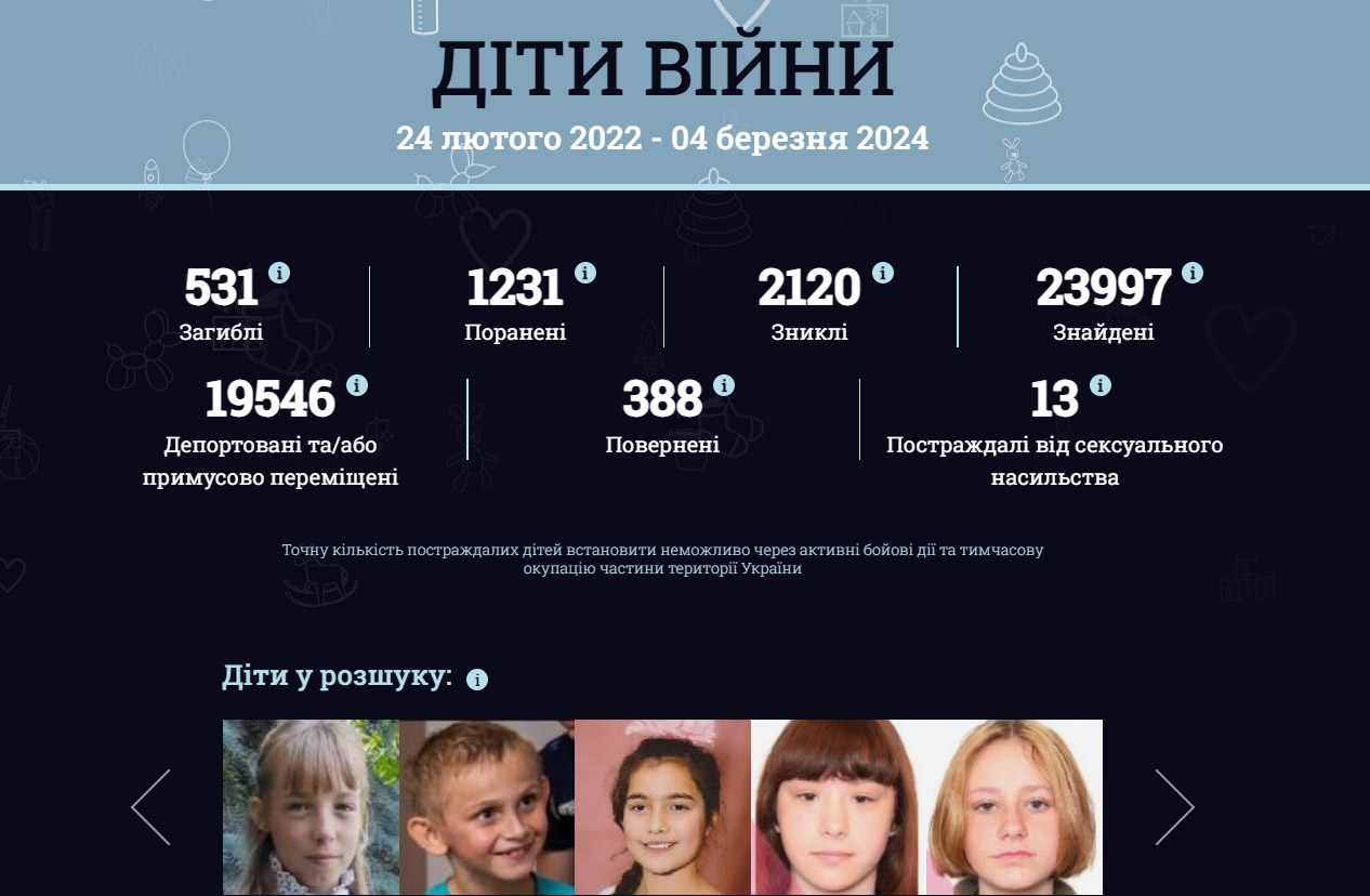 «Діти війни» – платформа, на яку можна повідомити та знайти всю інформацію про дітей, які постраждали внаслідок війни рф проти України. Платформа створена Міністерством реінтеграції разом з Національним інформаційним бюро за дорученням Офісу Президента України.