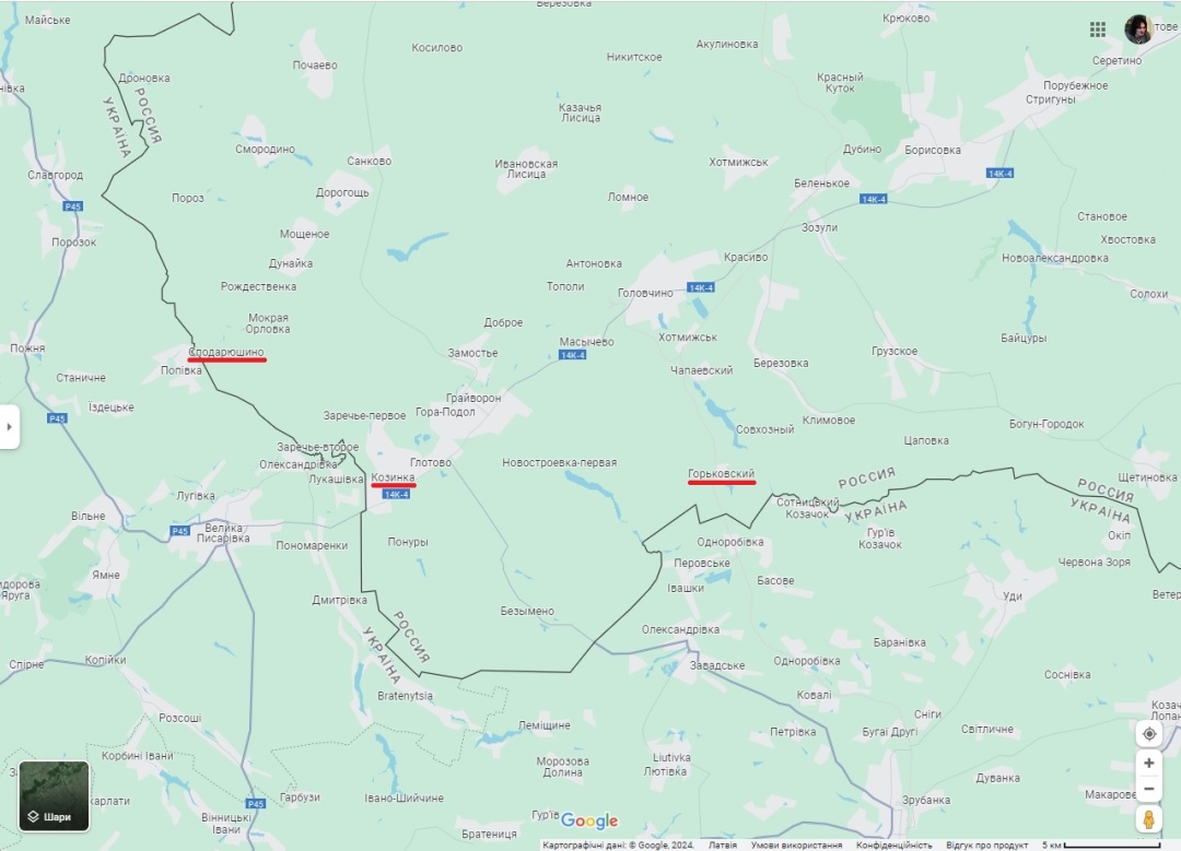 А тепер почитаємо Телеграм-канали Легіону «Свобода Росії», Російського добровольчого корпусу та Сибірського батальйону. З інформації, яка міститься в них, бачимо, що було проникнення в Тьоткіно (та підрив там трьох складів б/к), в Козинку,  а також в селище Горьковський (це в двох кілометрах від кордону з боку Одноробівки в напрямку Головчиного).  Яка ситуація наразі в цих населених пунктах, – невідомо – «туман війни»: можливо, частковий контроль, бої, входження та виходи. Інші пересування бійців ЛСР-РДК-СБ подані без локалізацій, тому встановити, де вони відбуваються, неможливо.