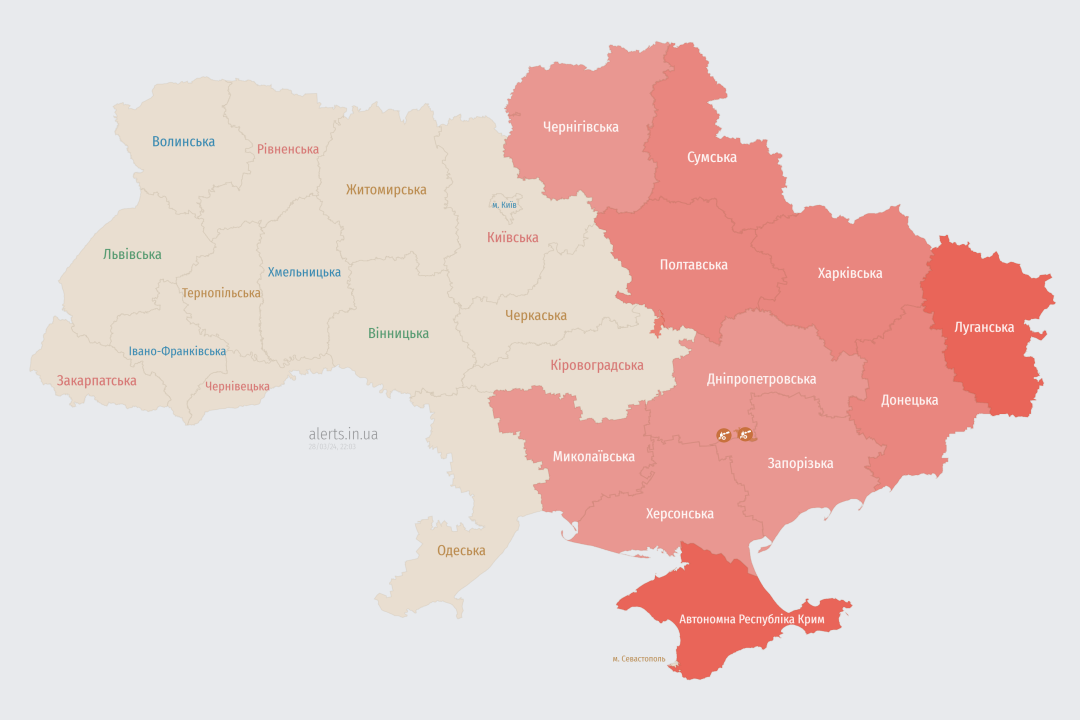 За кілька хвилин військові поінформували про ворожі БпЛА на межі Запорізької та Дніпропетровської областей, які летять у західному напрямку. А також про група БпЛА з Херсонщини у напрямку Дніпропетровської області.