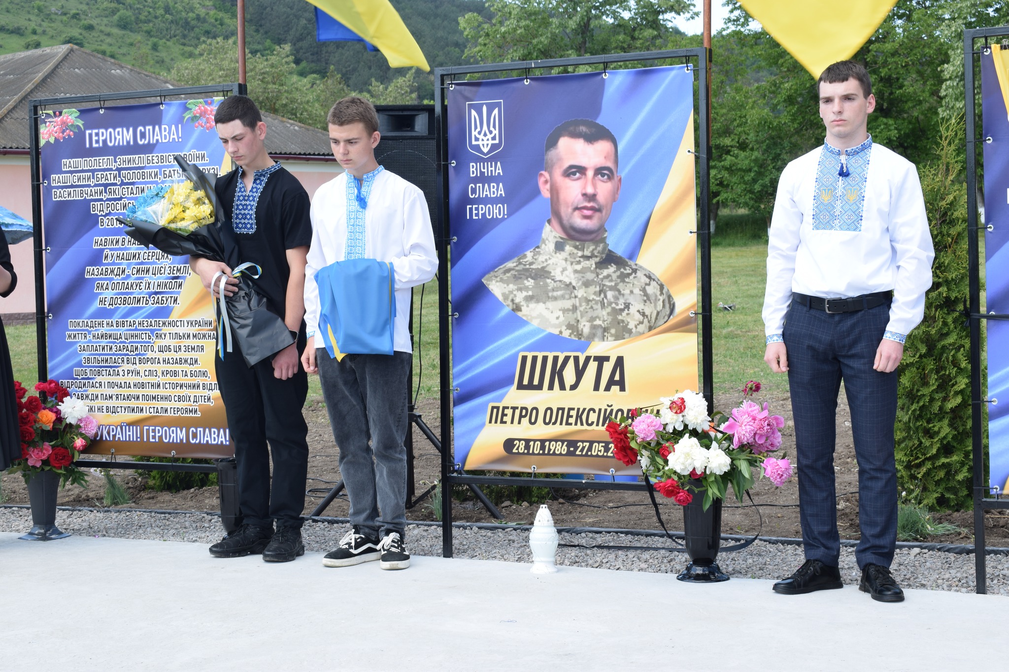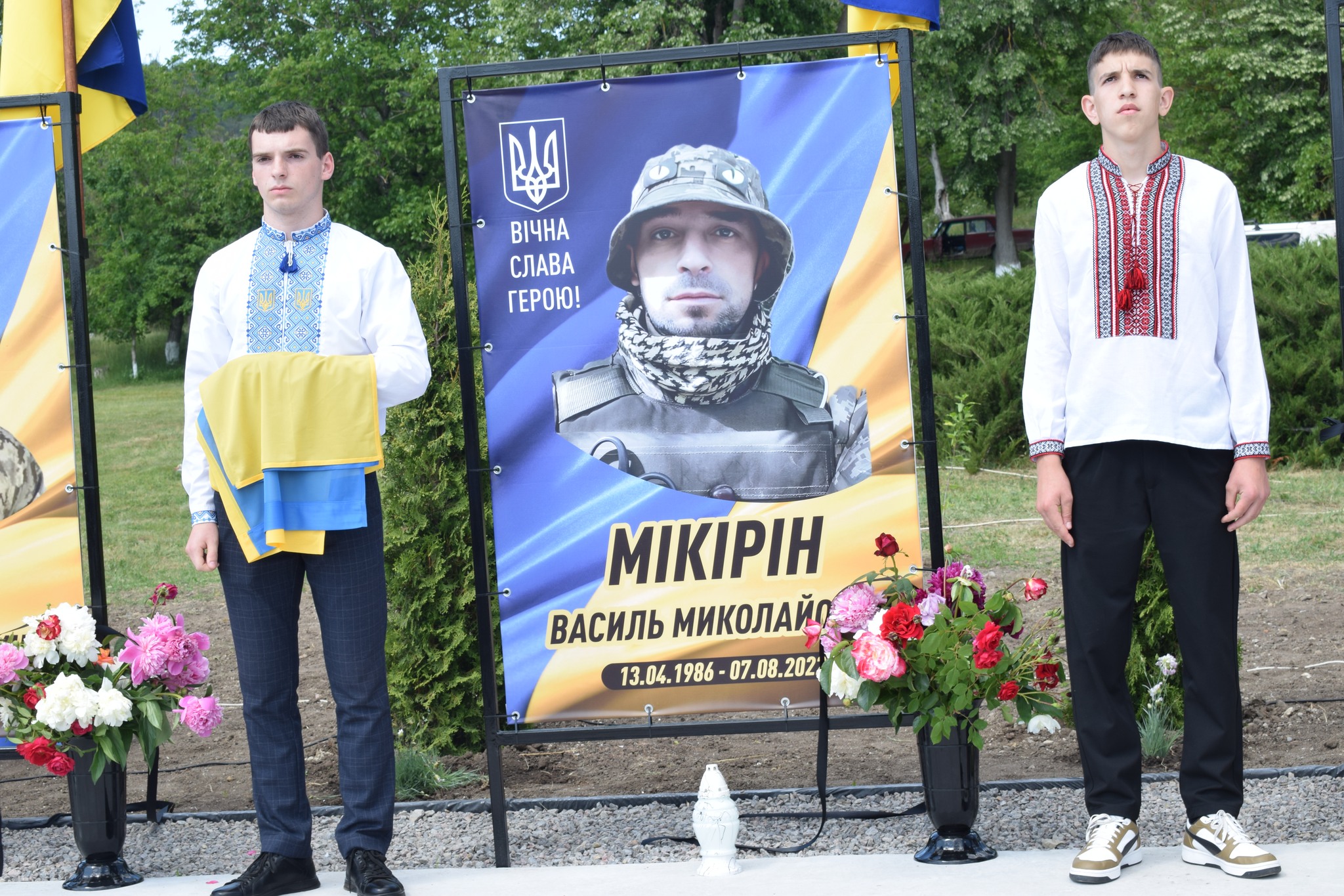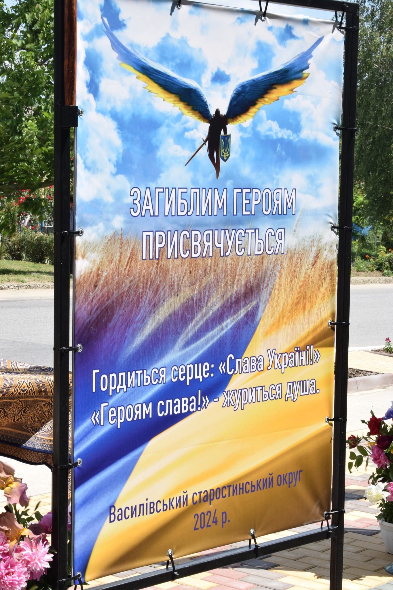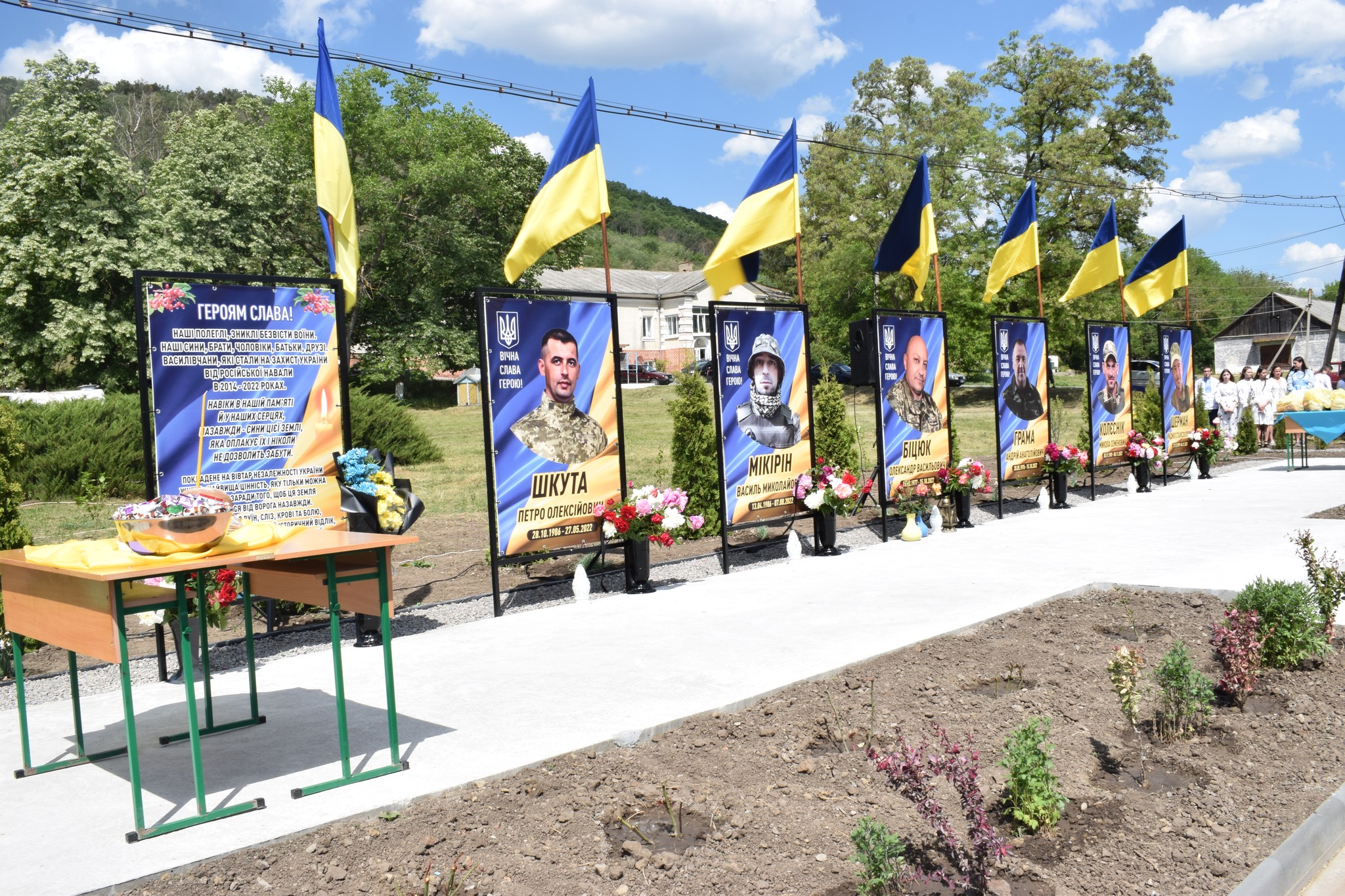 У селі Василівка майорять синьо-жовті стяги над світлинами полеглих… Петра Шкути, Василя Мікіріна, Олександра Біцюка, Радміла Шермана, Андрія Грами, Миколи Колєсніка.