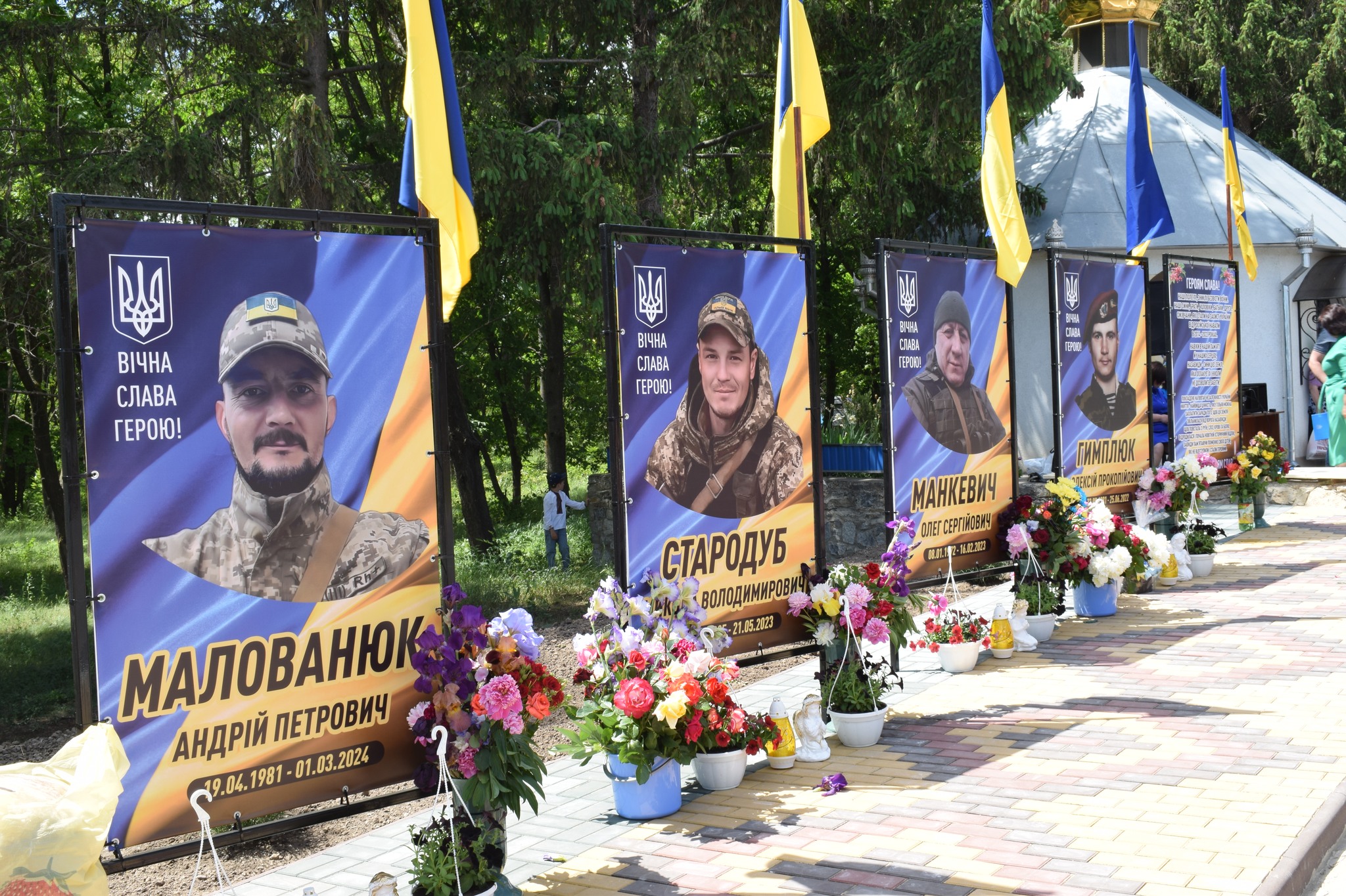 Лягли живі квіти до портретів Олега Манкевича, Олексія Гимлюка, Андрія Малованюка, Миколи Стародуба – у селі Ожеве.