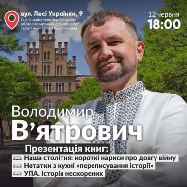 “12 червня, середа, у Чернівцях відбудеться презентація книг відомого українського історика, публіциста та дослідника Володимира В’ятровича: