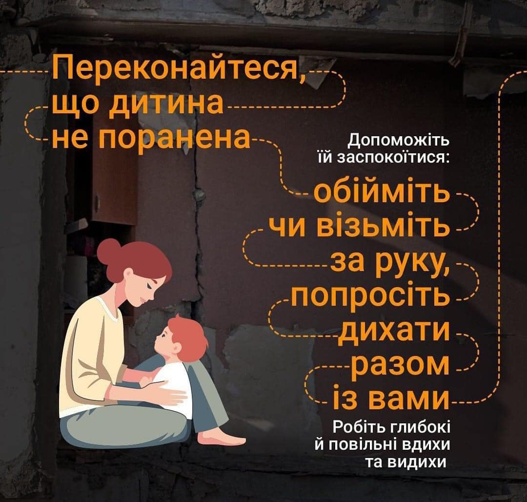 Переконайтеся, що дитина – не поранена. Допоможіть їй заспокоїтися: обійміть чи візьміть за руку, попросіть дихати разом із вами. Робіть глибокі й повільні вдихи та видихи.
