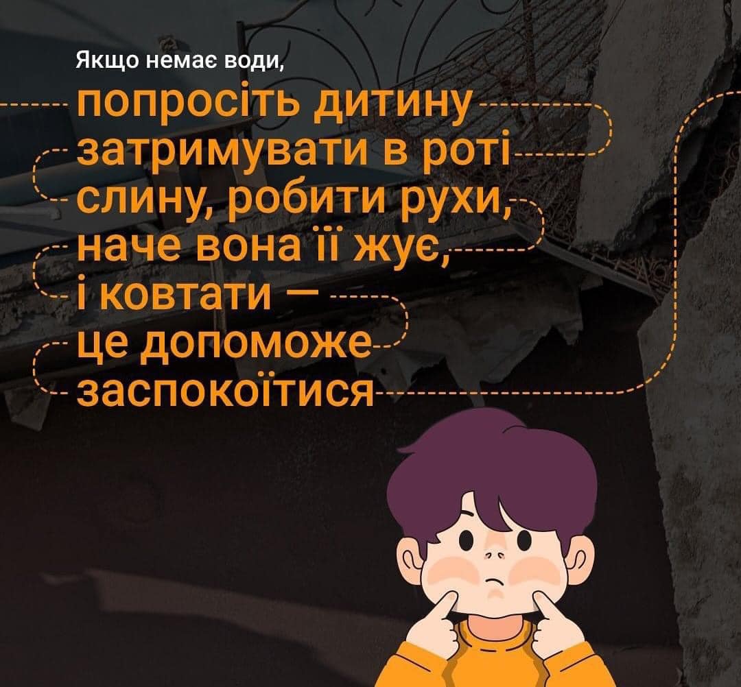 Якщо немає води, попросіть дитину затримувати в роті слину, робити рухи, наче вона її жує, і ковтати. Це допоможе заспокоїтися.