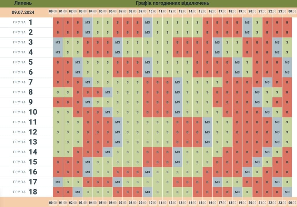 Як зазначають в обленерго, у графіку погодинних вимкнень відображаються години гарантованого ввімкнення електроенергії (зелені клітинки) та години, коли ваші оселі будуть точно знеструмлені (позначені червоним кольором).